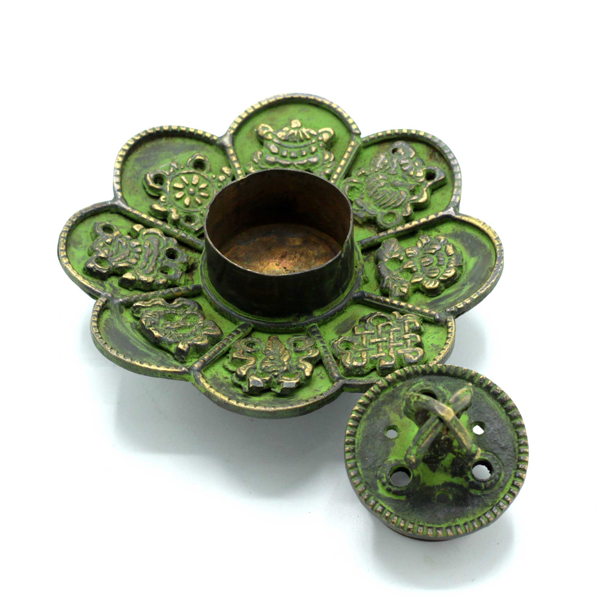 Ce Cône Tibétain et Brûleur d'Encens - Huit Symboles est fabriqué à la main avec dévotion en Inde à partir du laiton le plus fin. Ces porte-encens sont réalisés par des artisans qualifiés.