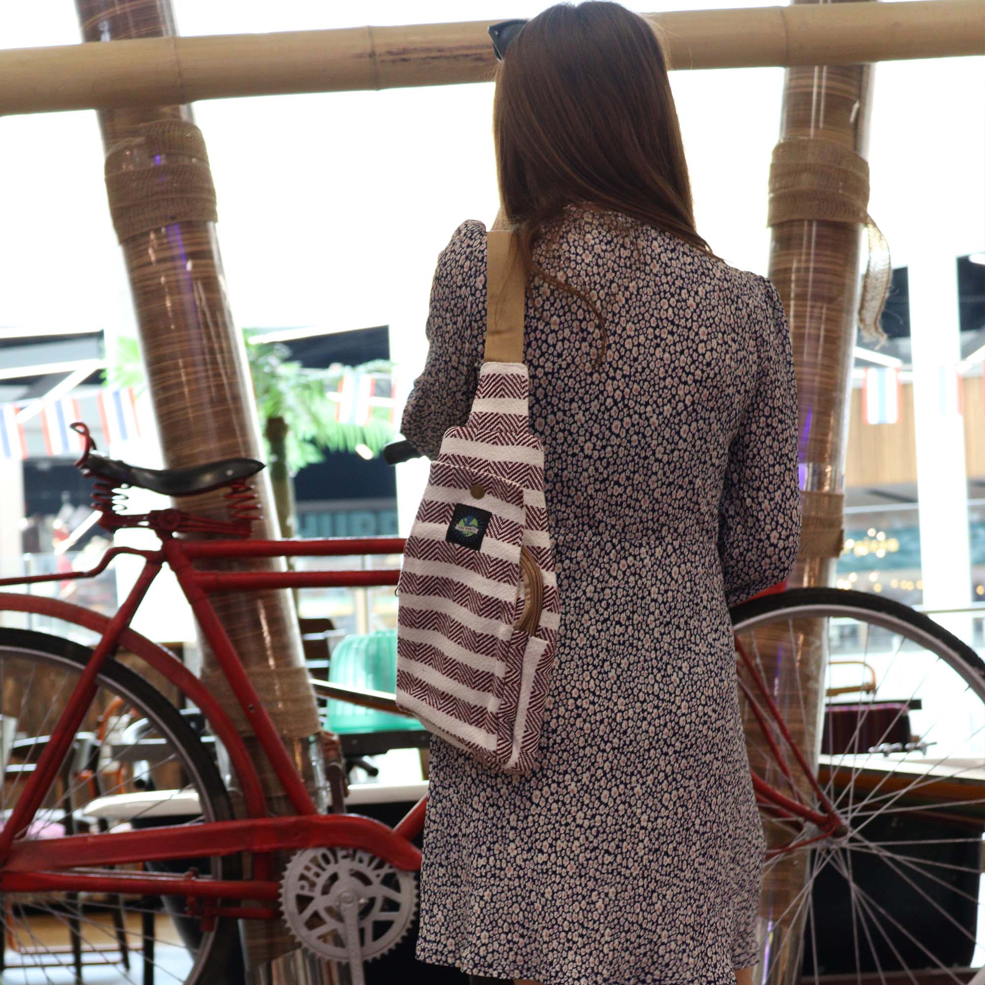Fabriqué en coton naturel dans des coloris bordeaux et blanc intemporels, ce Sac polyvalent à bandoulière associe des matériaux respectueux de l'environnement à un style sans effort. Idéal pour un usage quotidien, il offre fonctionnalité et organisation sans compromettre l'esthétique.