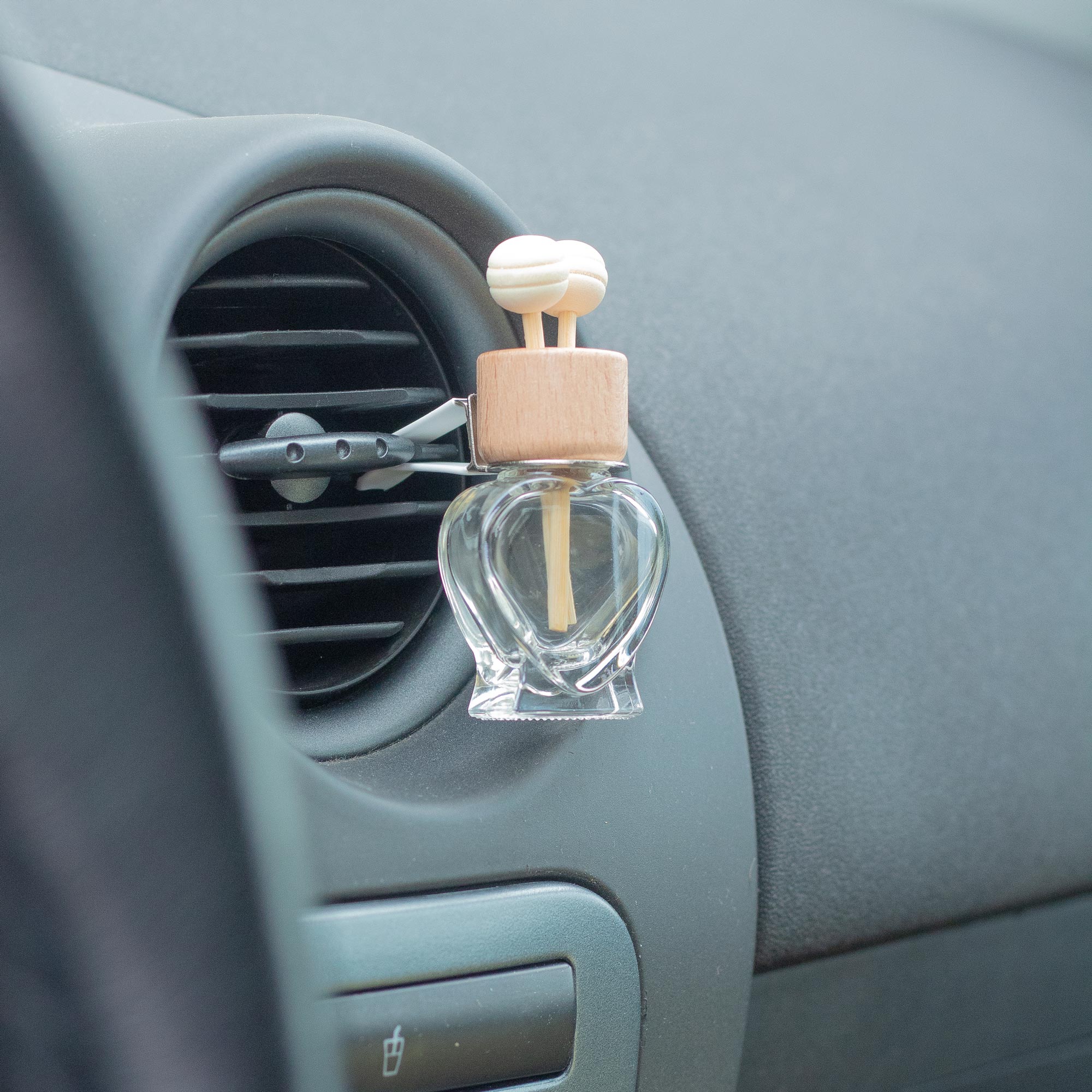 Alliant praticité et charme naturel, ces bouteilles diffuseur pour voiture à clipser sur les aérateurs présentent un verre transparent et des bouchons en bois clair, pour un look frais et artisanal.