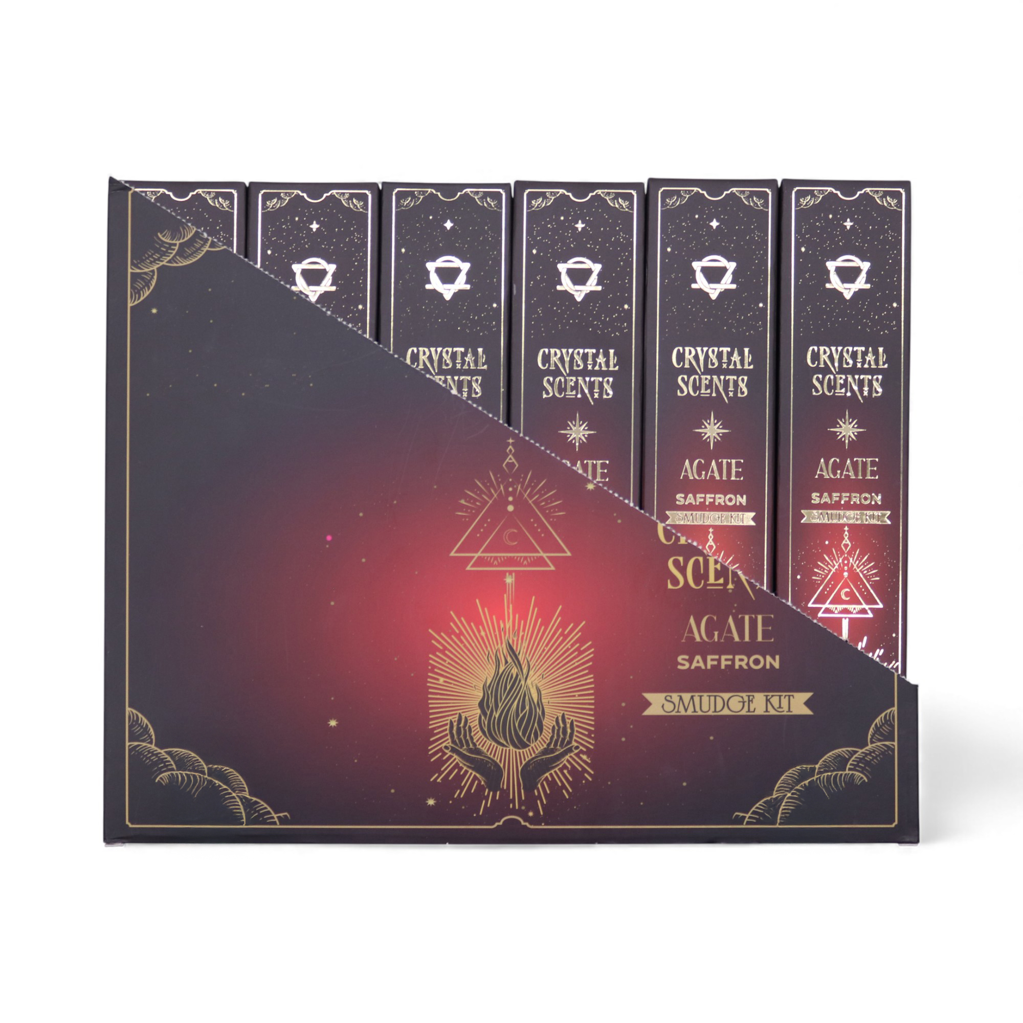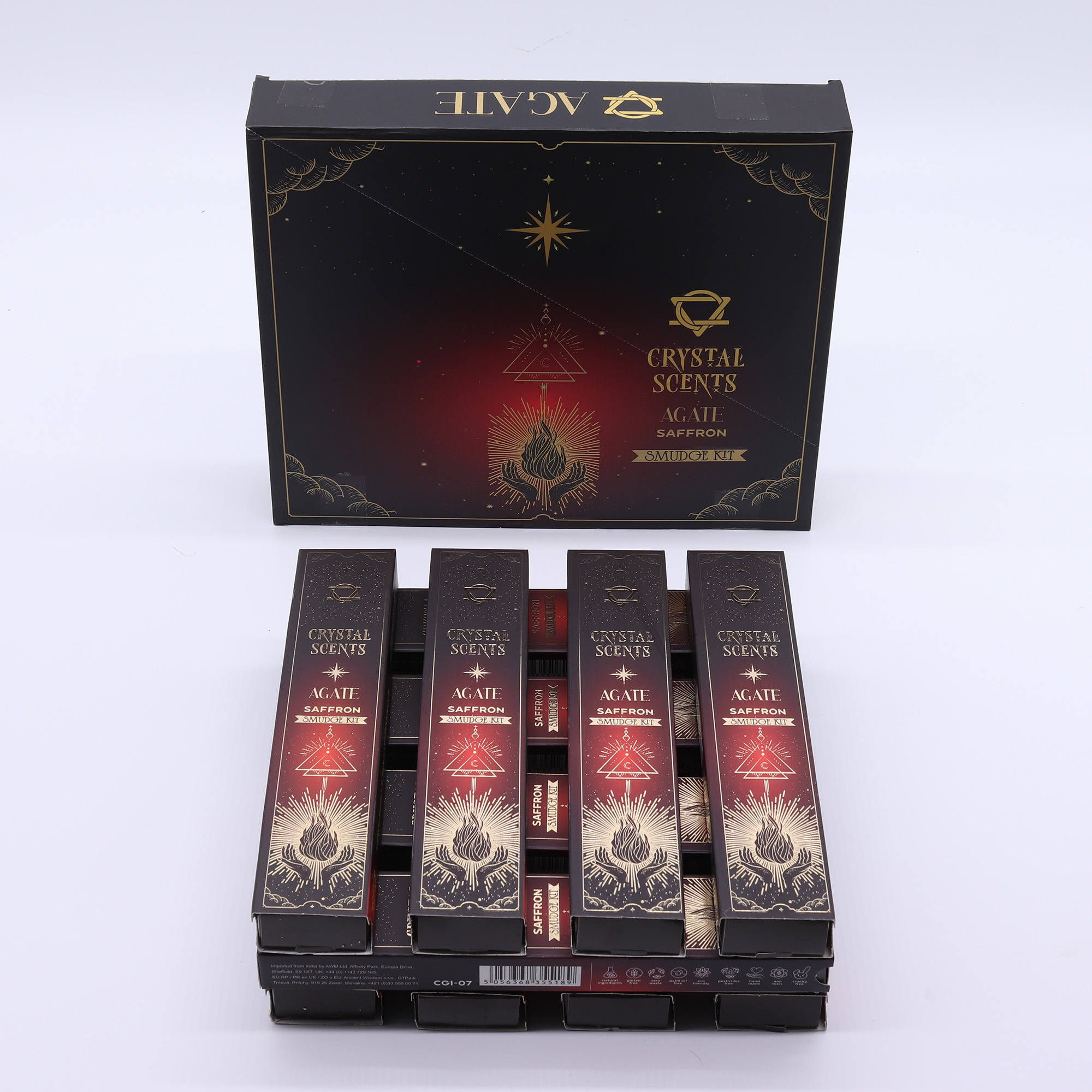 Cet encens associe le parfum chaleureux du safran à un cristal d’agate rouge, créant un rituel d’ancrage pour les clients recherchant stabilité et force intérieure.