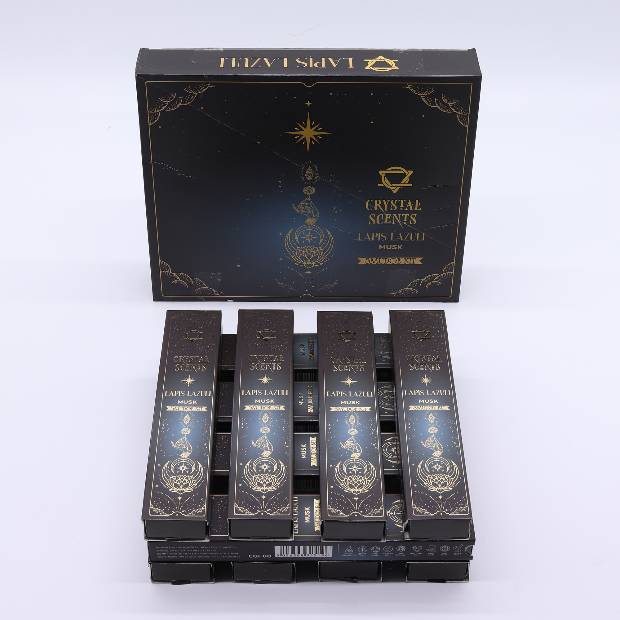 Ce mélange associe le musc classique à un cristal de lapis-lazuli, séduisant les clients intéressés par l’intuition, la communication et la vérité intérieure. Le lapis est lié à la sagesse et à l’expression claire, parfait pour la méditation ou les moments d’étude.