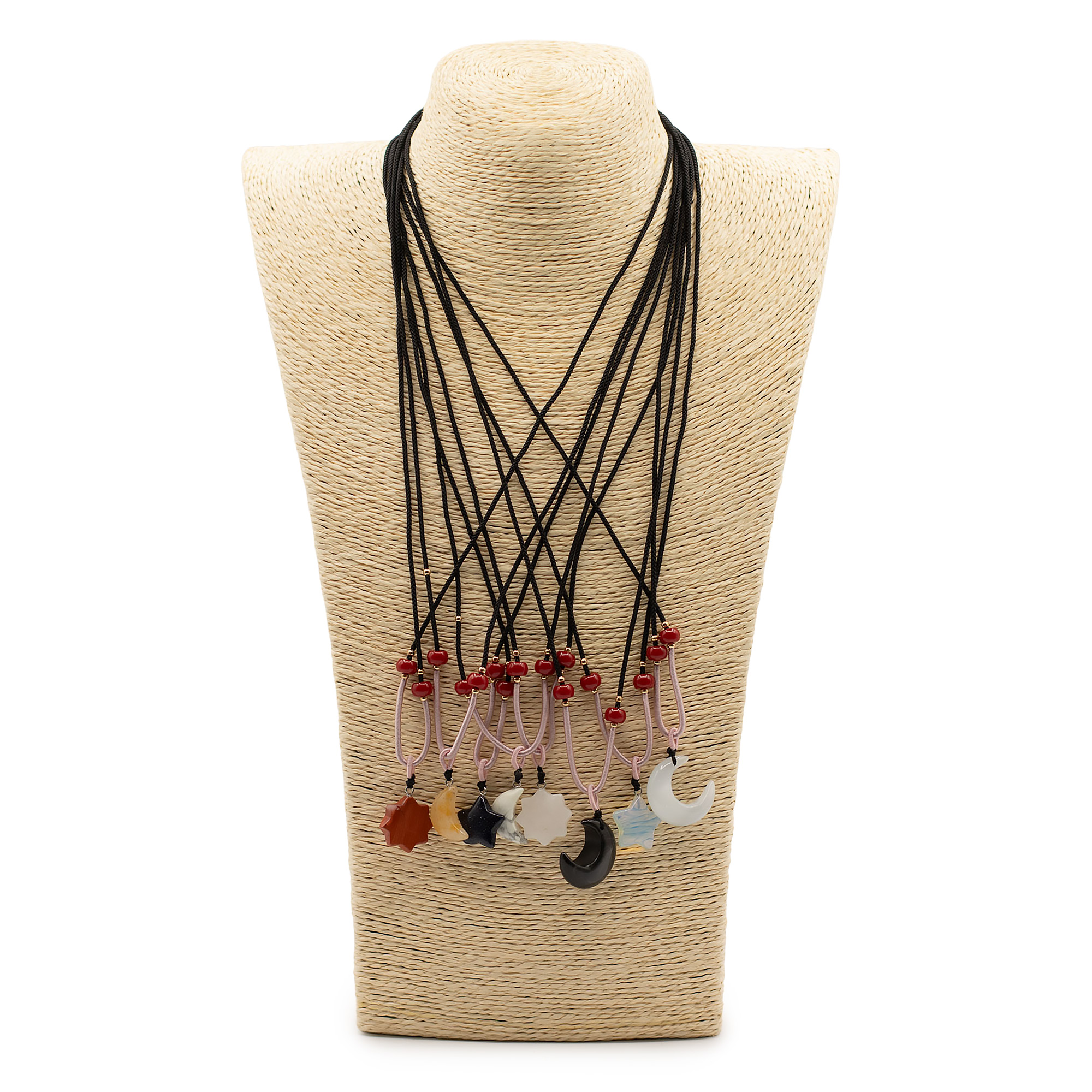 Élargissez votre gamme de bijoux avec les 8 Colliers Cordon de la Collection Céleste. Ce lot mixte met en valeur des pendentifs en pierre sculptés à la main inspirés du ciel nocturne, offrant un ajout visuel attractif pour les boutiques cadeaux, magasins de cristaux et boutiques spirituelles.