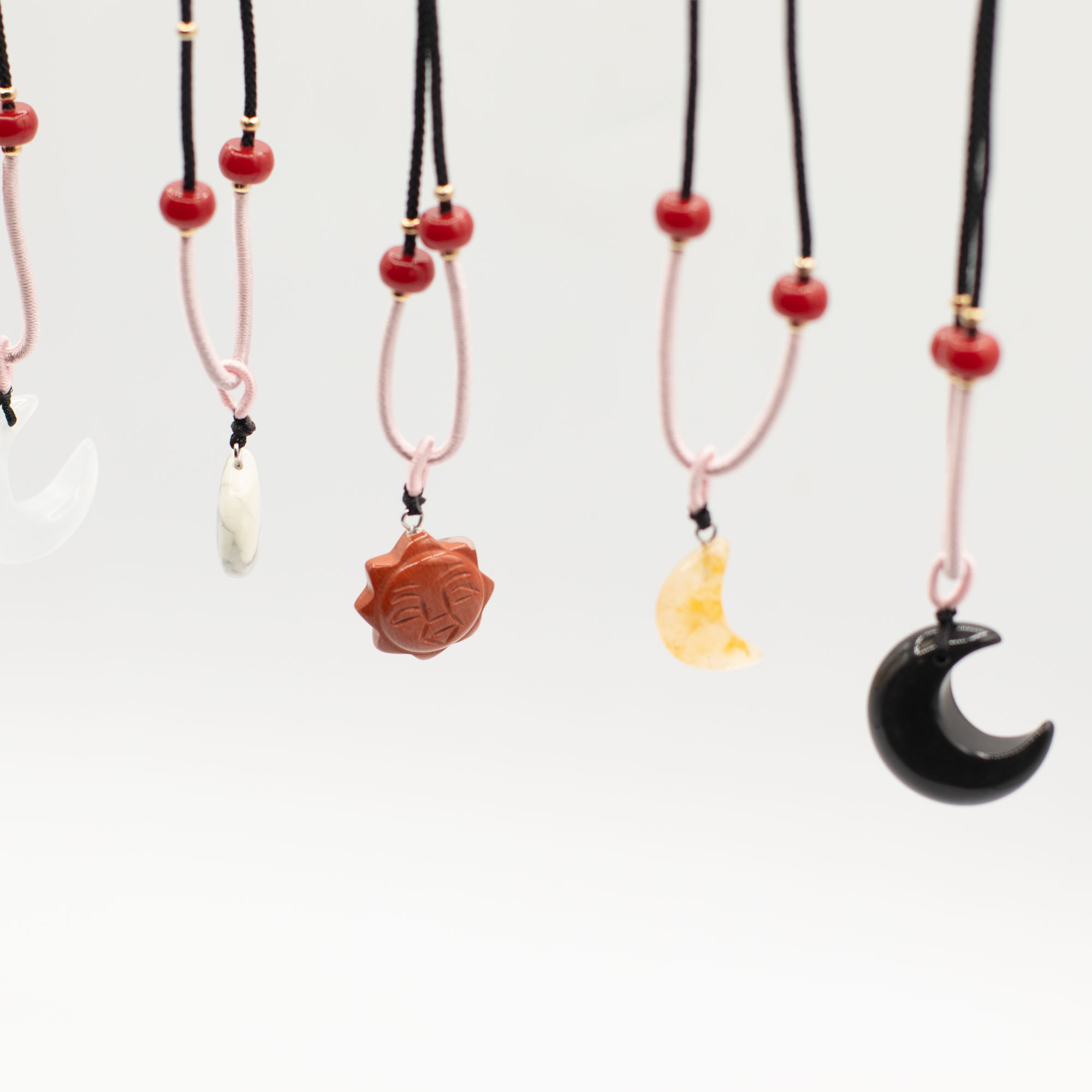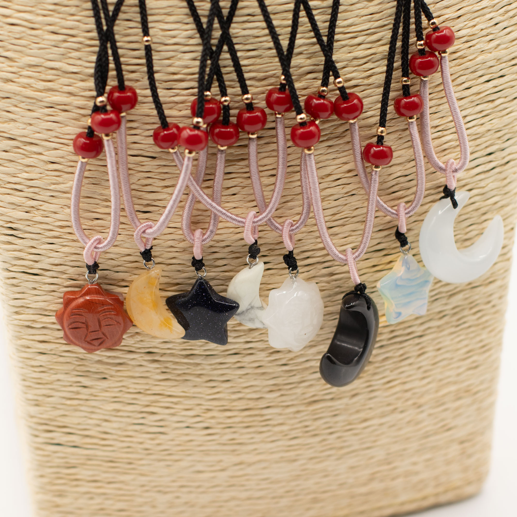 L’assortiment comprend des motifs cosmiques populaires, notamment soleils, lunes et étoiles, chacun sculpté dans des pierres naturelles. Les variations de teintes et de textures assurent que chaque pièce se distingue tout en conservant une thématique céleste cohérente.