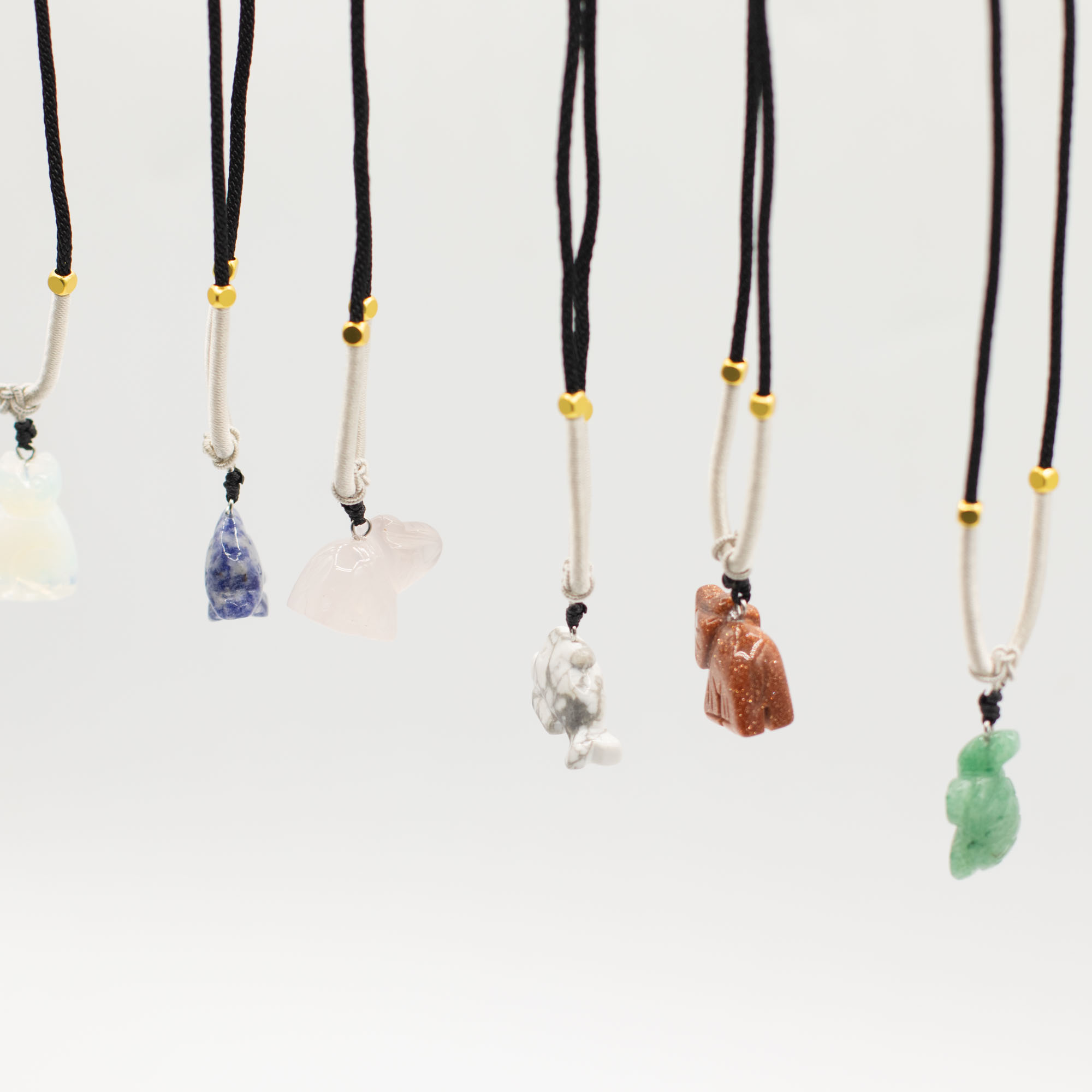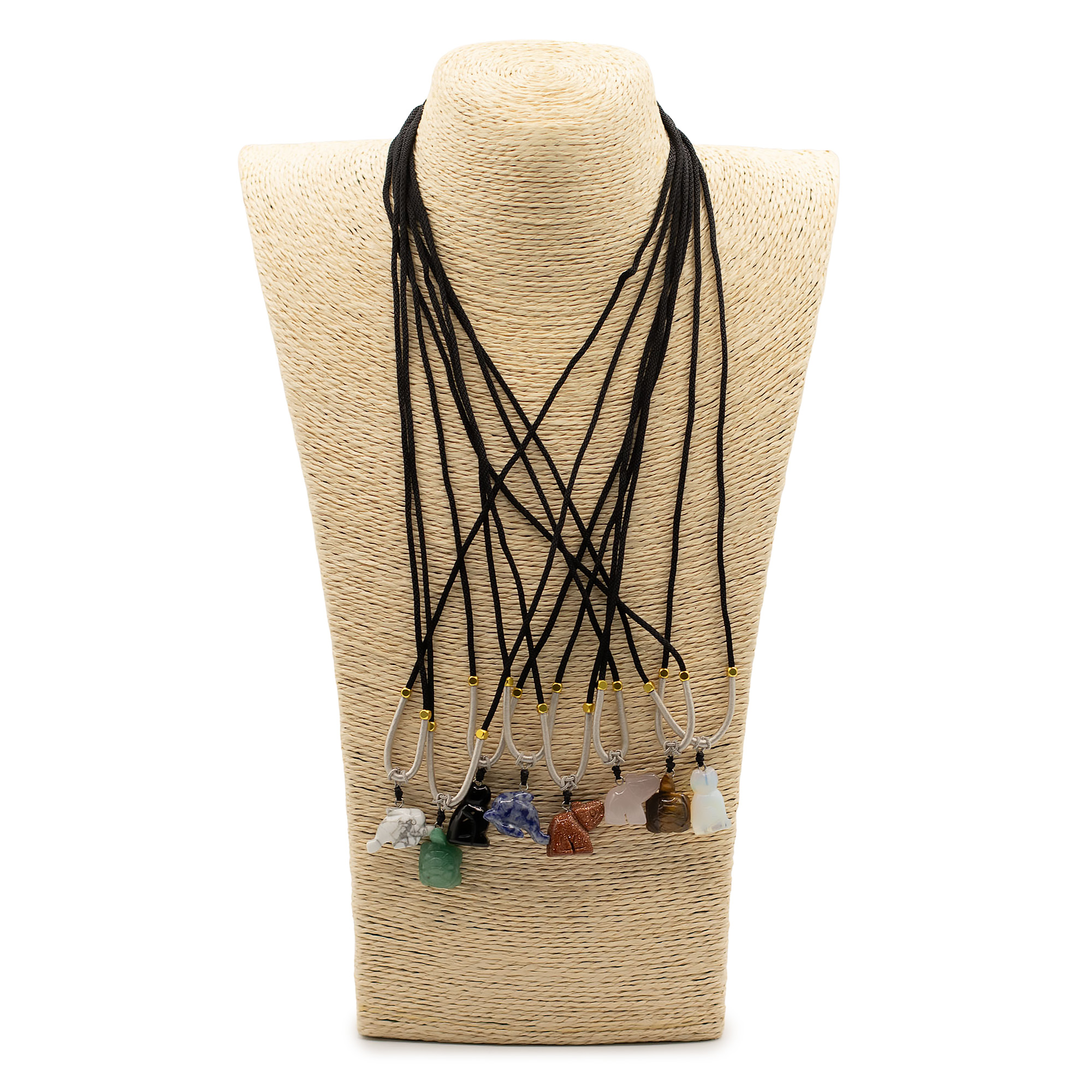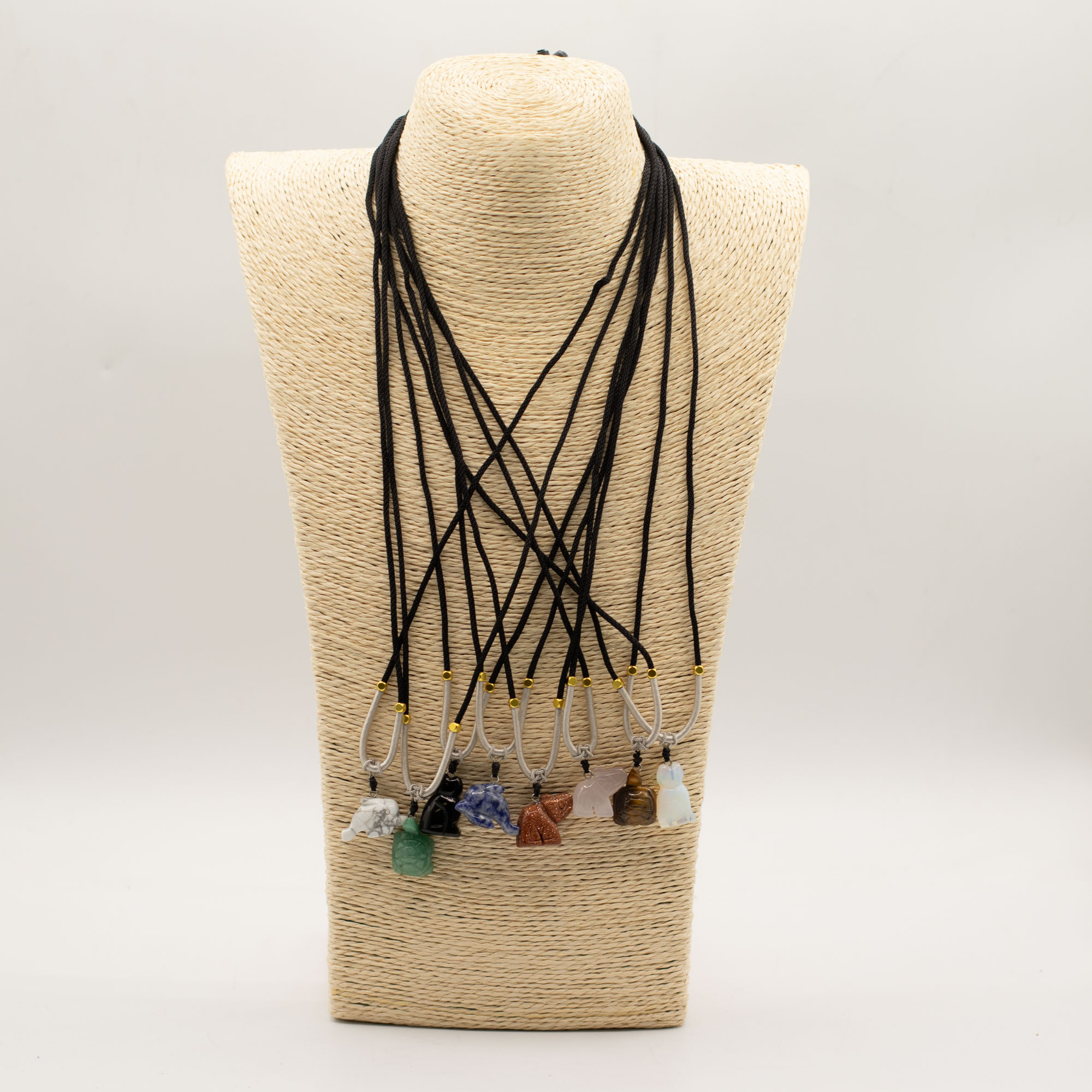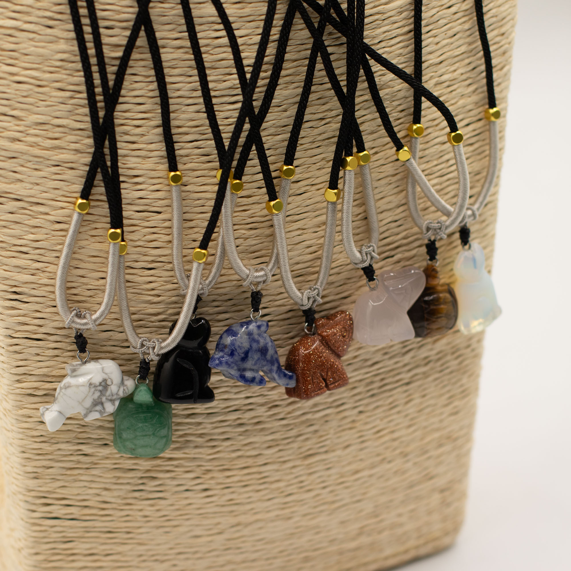 L’assortiment comprend des animaux tels qu’éléphants, tortues, dauphins, chats et d’autres créatures appréciées. Chaque pièce est sculptée dans une pierre naturelle, créant de subtiles différences de couleur, de texture et de finition, ce qui rend chaque collier unique.