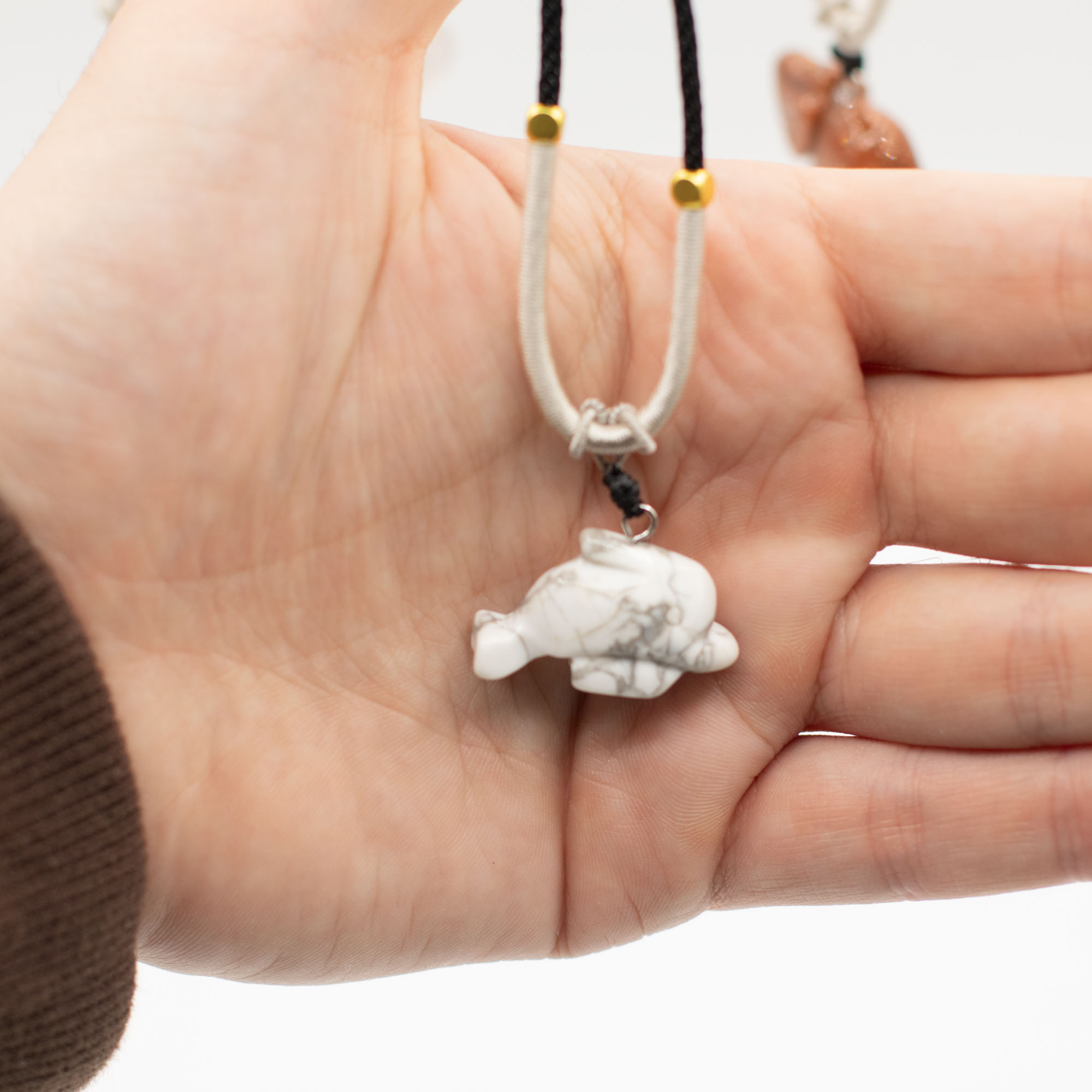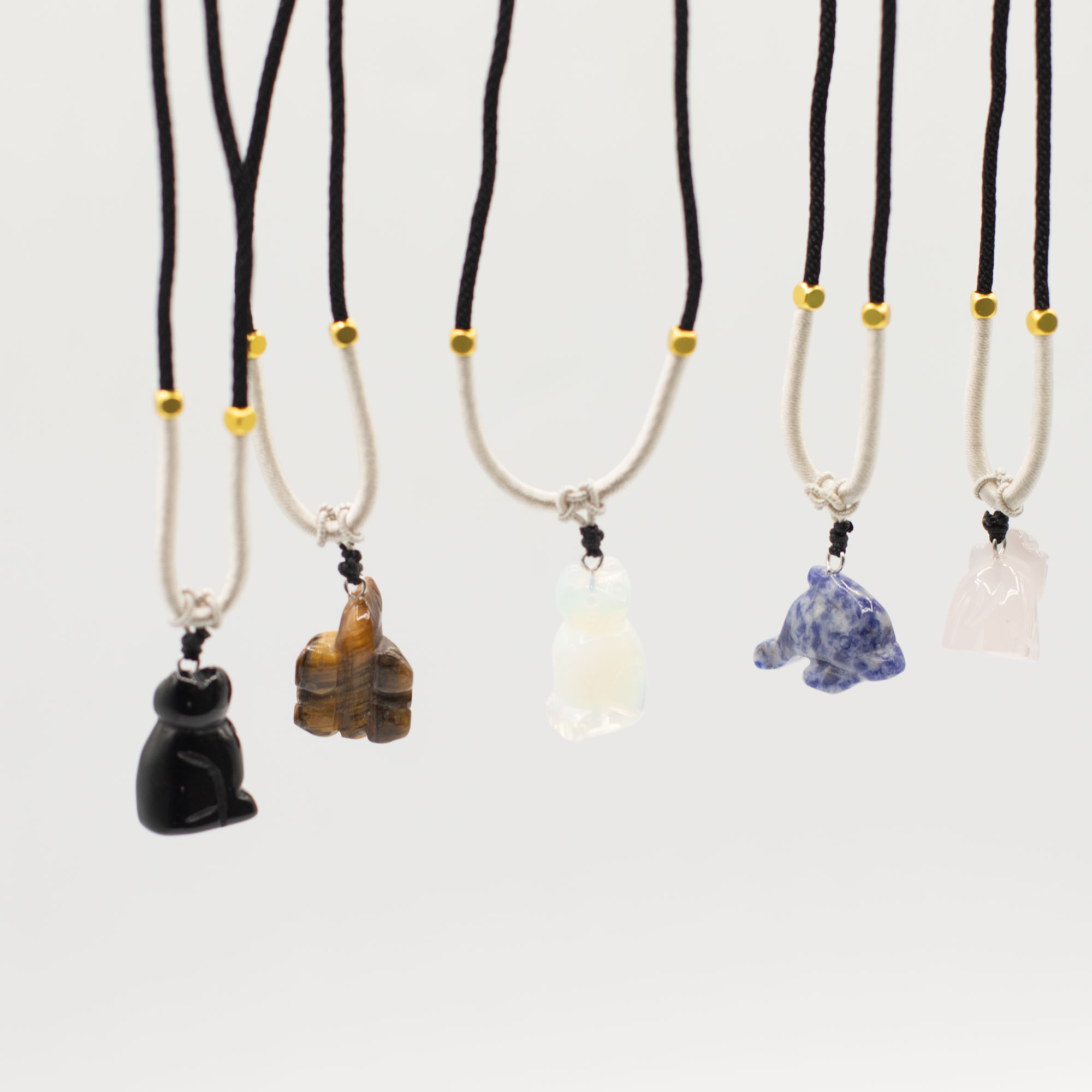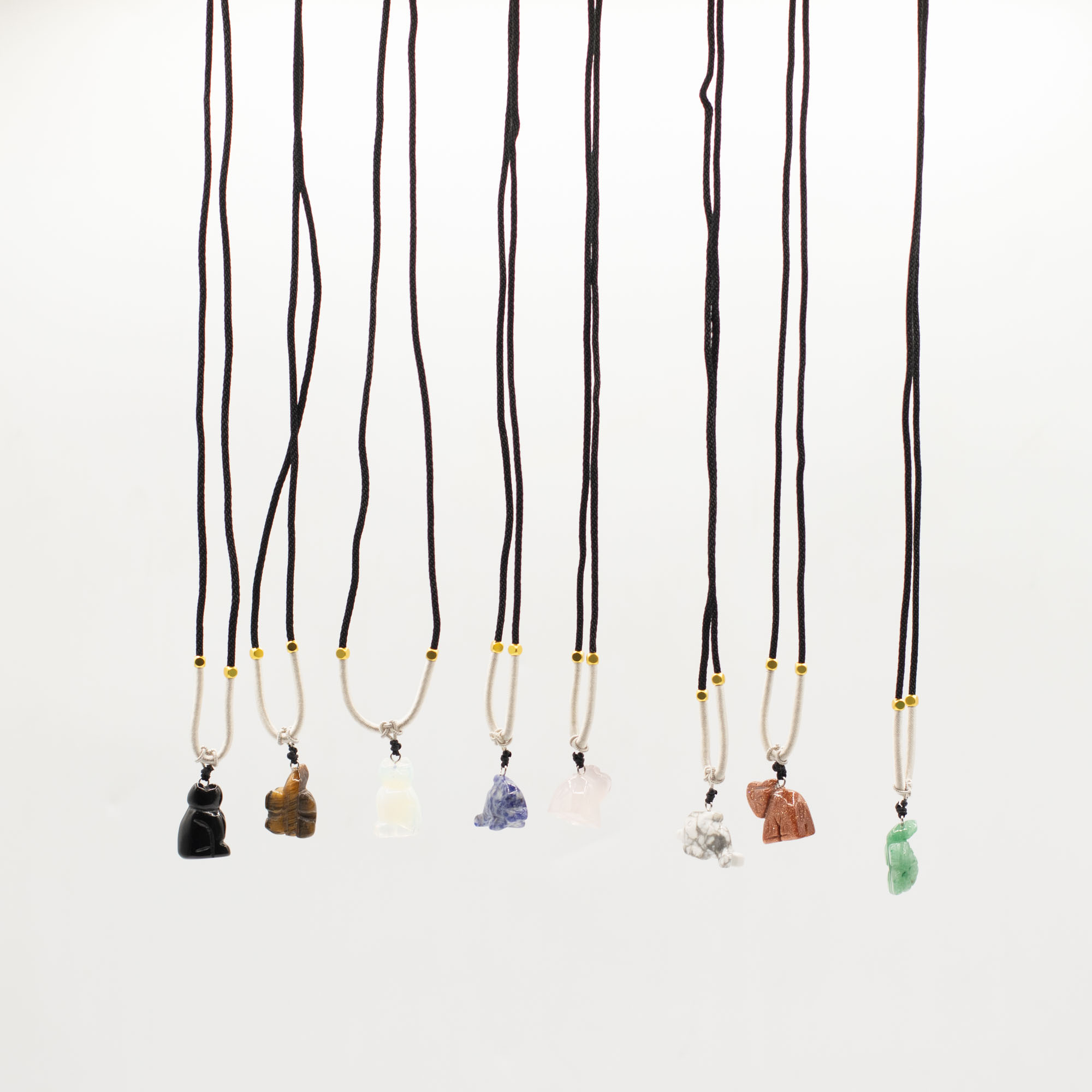L’assortiment comprend des animaux tels qu’éléphants, tortues, dauphins, chats et d’autres créatures appréciées. Chaque pièce est sculptée dans une pierre naturelle, créant de subtiles différences de couleur, de texture et de finition, ce qui rend chaque collier unique.