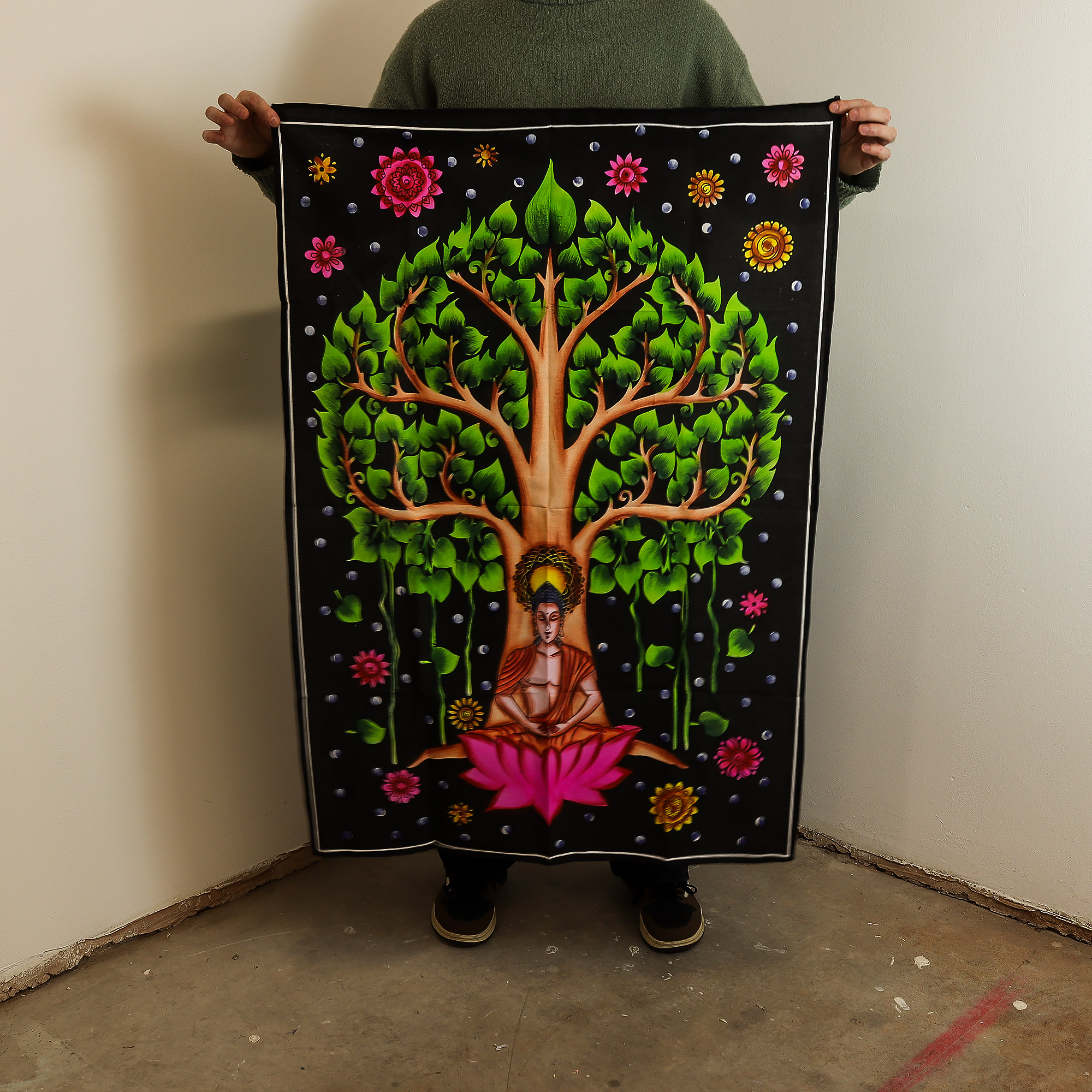 Cette tenture murale apaisante d’origine indienne représente le Bouddha méditant sous l’arbre de la Bodhi, symbole intemporel de l’illumination et de la paix intérieure.