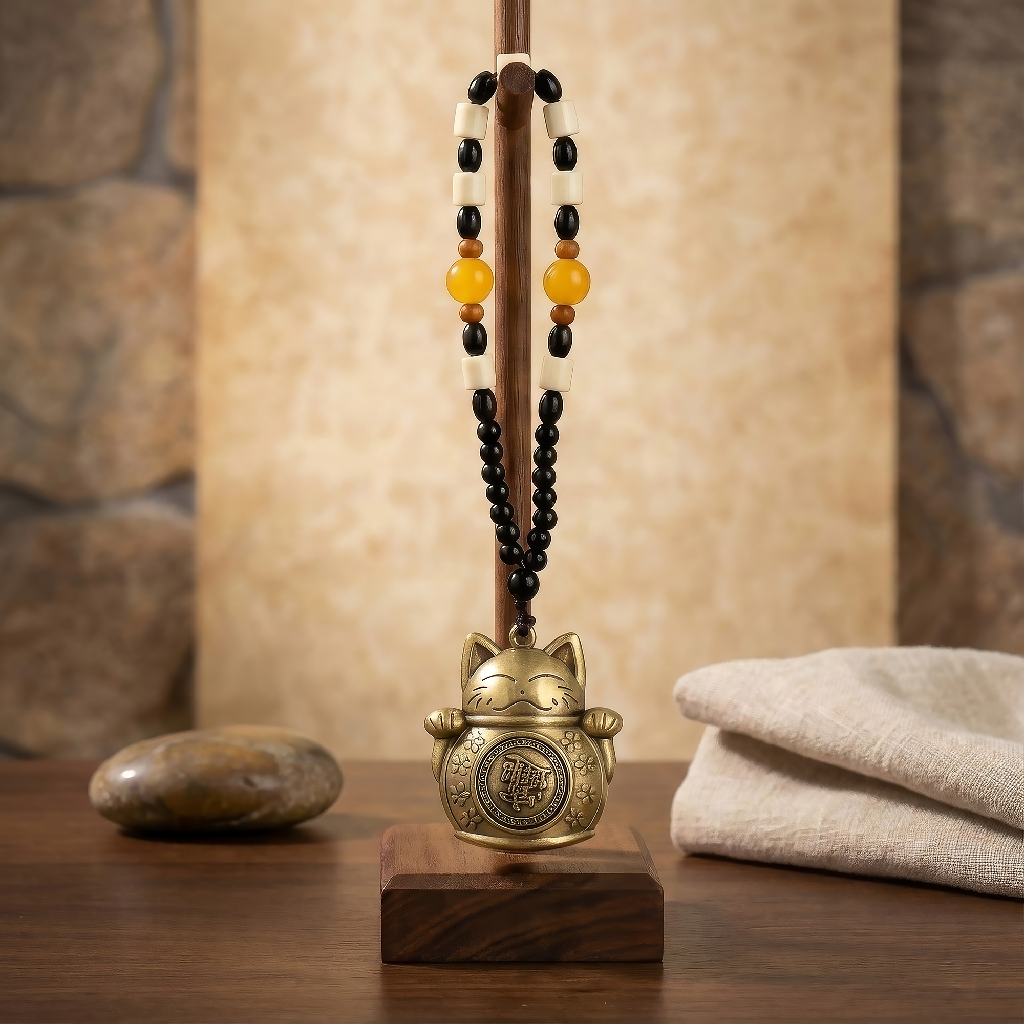 Suspendu à un cordon de perles combinant noir, crème, ambre et bois, cet objet offre un contraste visuel équilibré et un usage harmonieux des couleurs Feng Shui. Il peut être accroché près des entrées, caisses, bureaux, étagères ou zones de richesse dans la maison ou au travail, où il est traditionnellement utilisé pour accueillir la prospérité et protéger l’énergie financière.