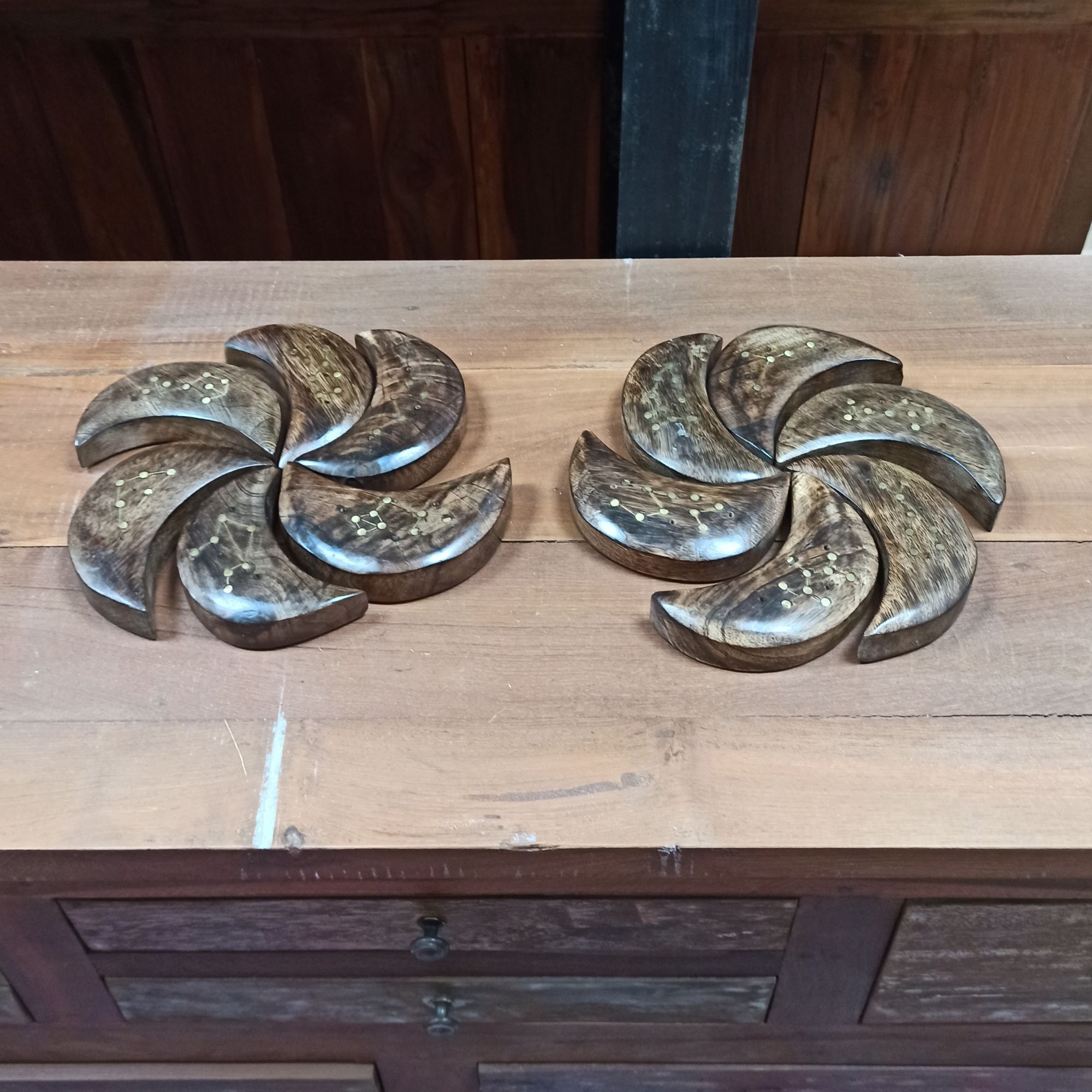 Nous vous présentons notre envoûtant lot de 12 brûleurs d'encens en laiton gravé - Lune, une collection distinctive qui marie harmonieusement l'artisanat artistique et l'attrait du symbolisme astrologique.