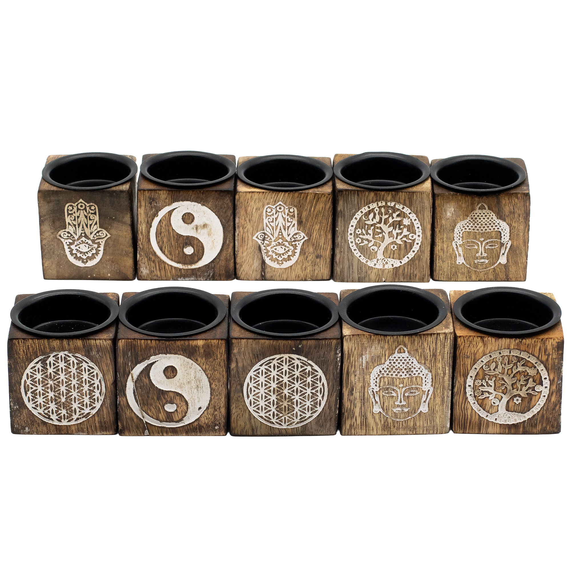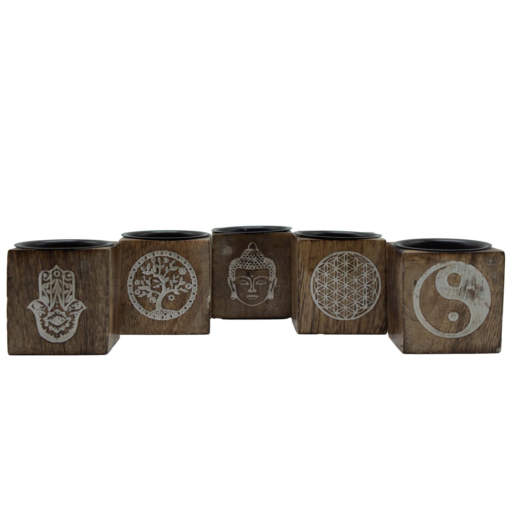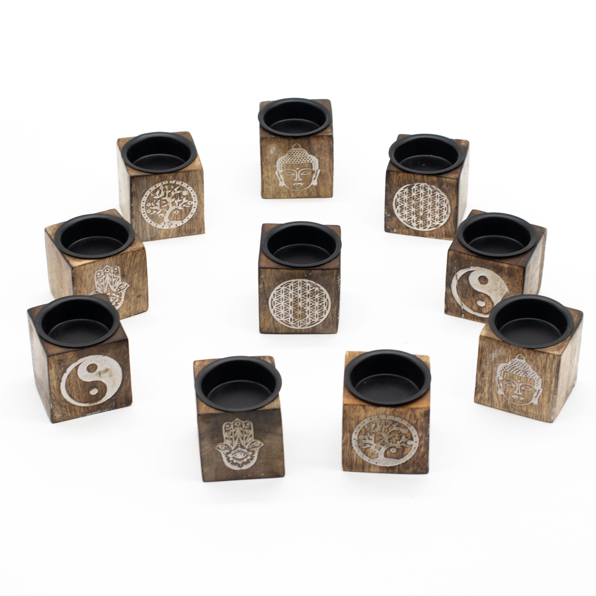 Conçu pour trouver sa place dans de nombreuses gammes. Cette sélection ésotérique comprend dix supports cubes en bois massif, chacun gravé d’un motif symbolique différent comme la Hamsa, le Yin Yang, la Fleur de Vie, l’Arbre de Vie et le Bouddha. Le grain naturel du bois confère à chaque pièce un caractère unique, tandis que les symboles gravés ajoutent signification et profondeur visuelle.