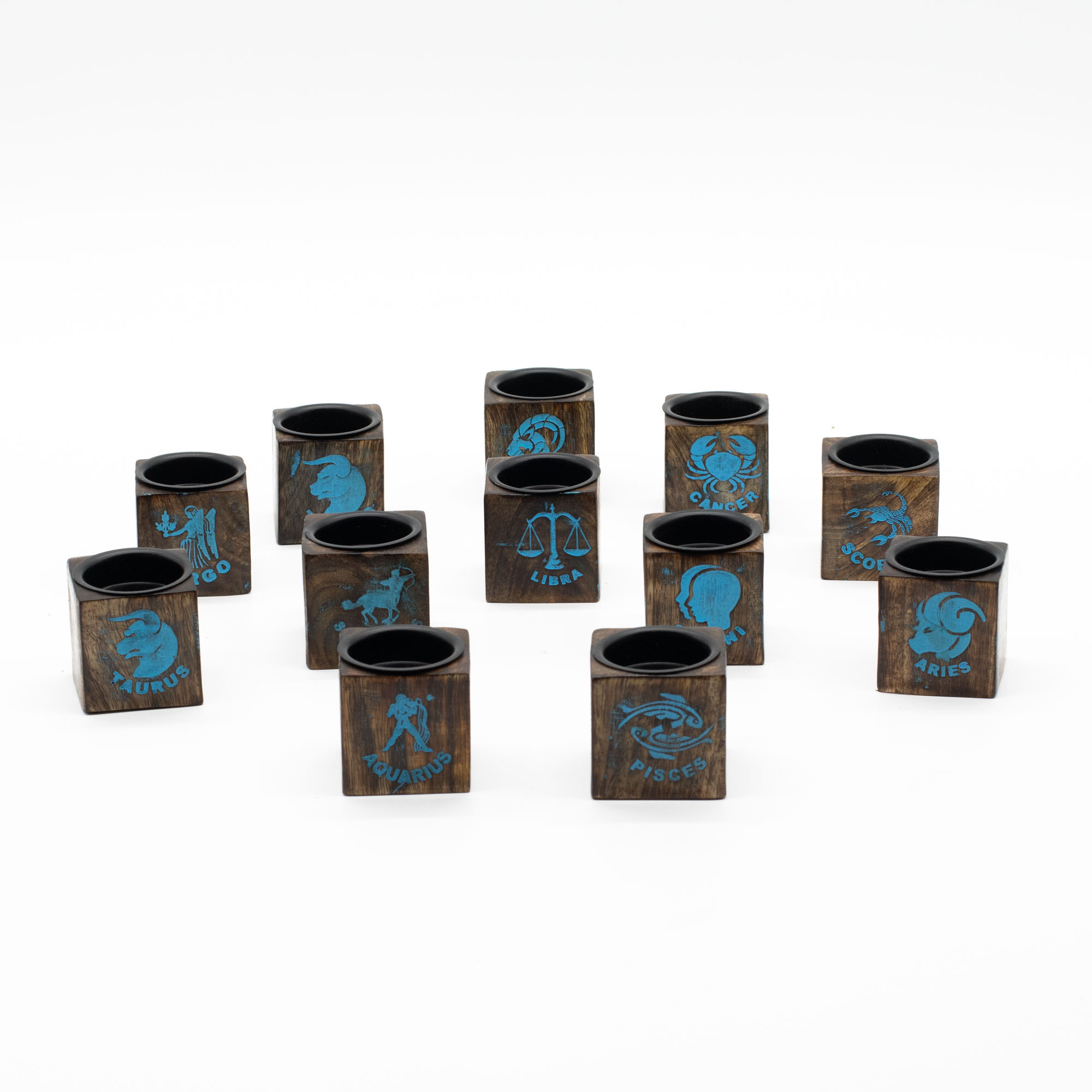 Un ensemble complet du zodiaque, conçu pour séduire les passionnés d’astrologie. Cette Sélection Zodiaque comprend douze supports cubes en bois massif, chacun gravé du symbole et du nom d’un signe astrologique, de Bélier à Poissons. Le contraste entre le bois naturel et les détails turquoise donne à l’ensemble un look distinctif et attrayant, tout en restant tactile et chaleureux.