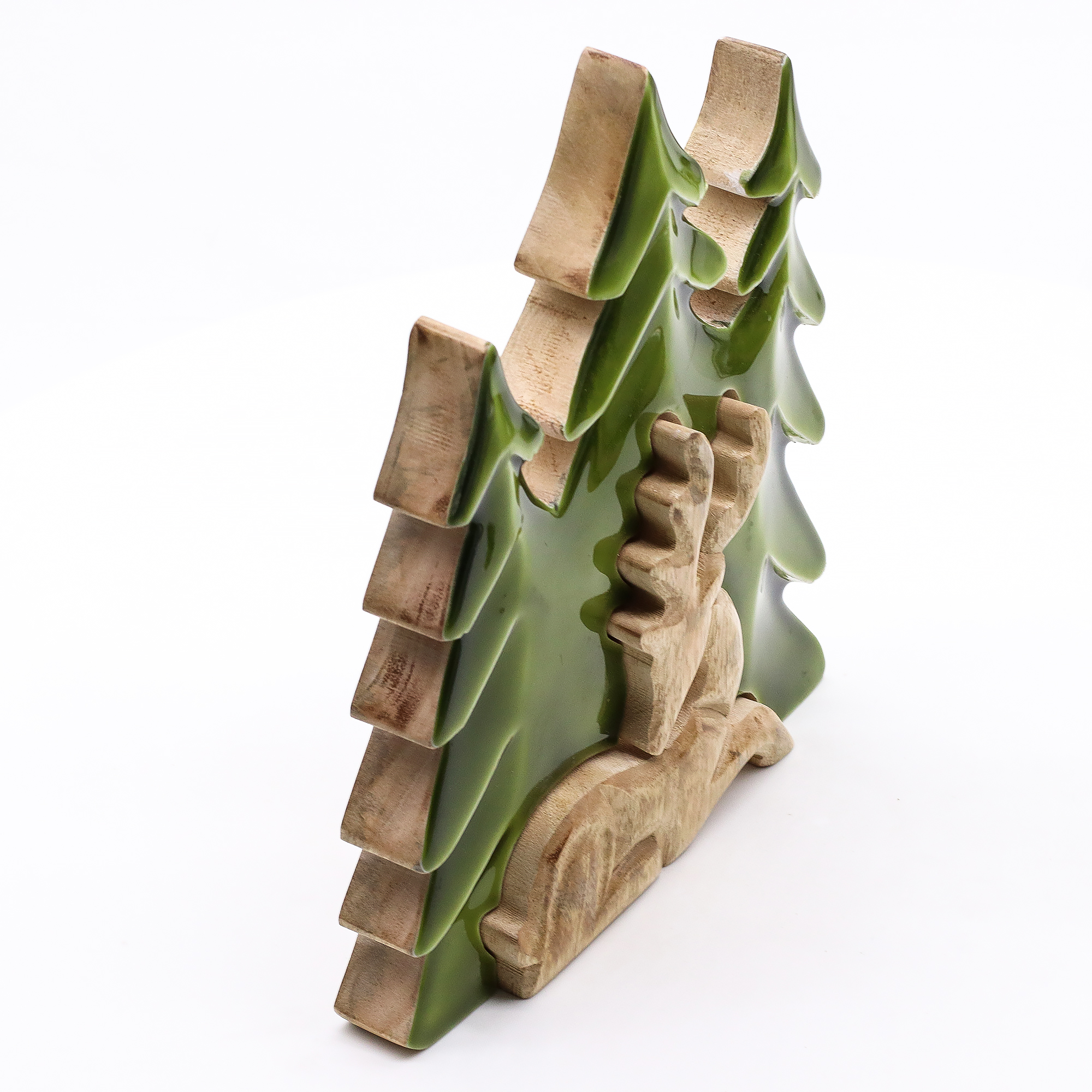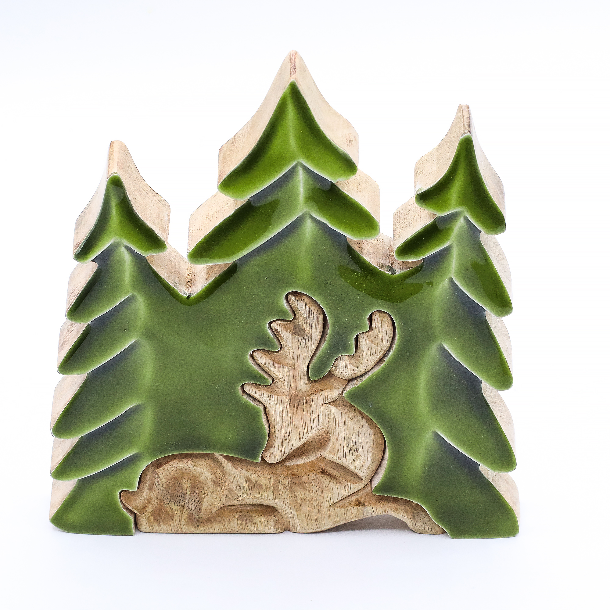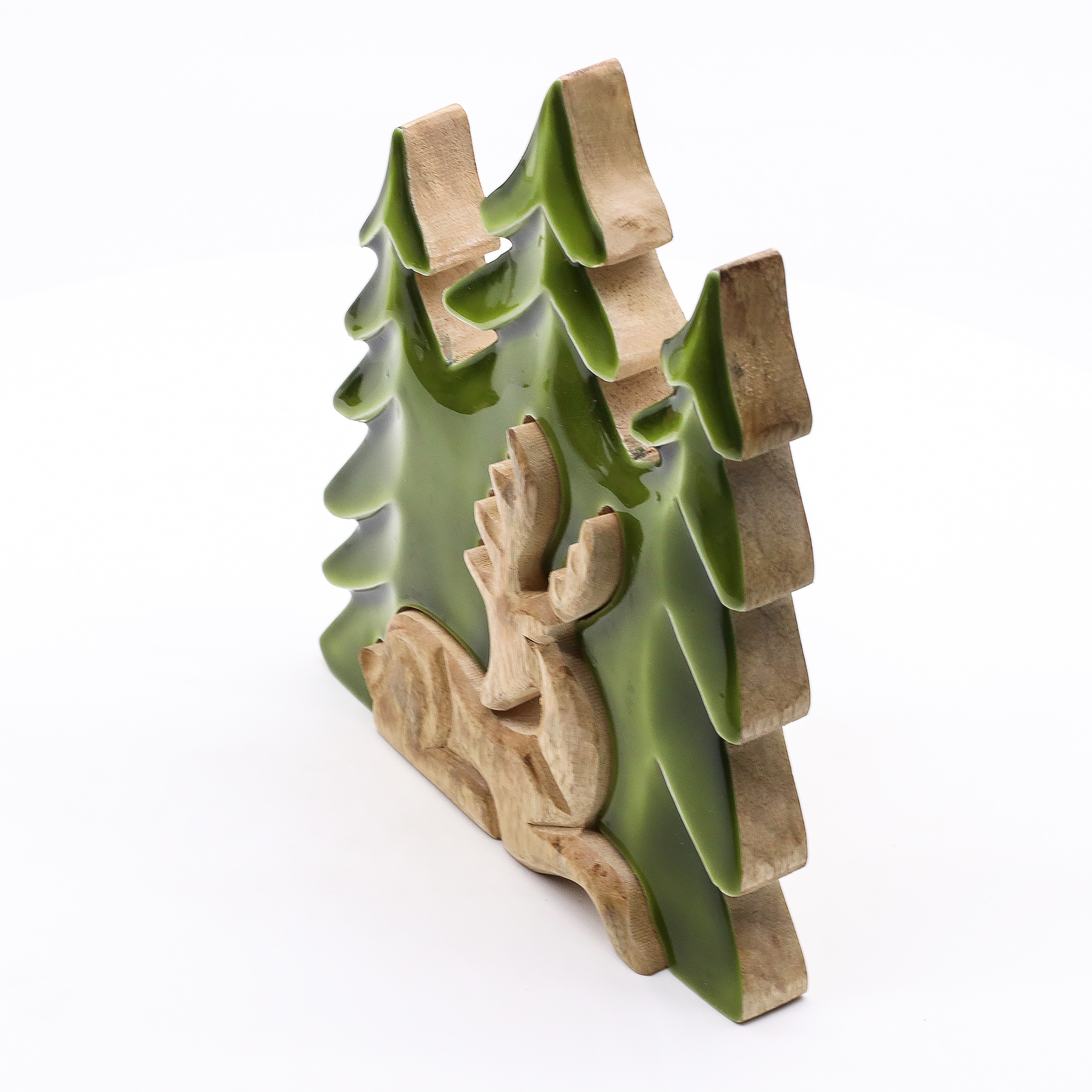 Sa finition émaillée brillante, associée à des accents verts profonds, sublime la texture naturelle du bois tout en évoquant la profondeur et la richesse des paysages forestiers. Fabriquée selon les principes du commerce équitable, cette décoration unique constitue un cadeau marquant ou un élément central idéal dans une collection déco inspirée de la nature.