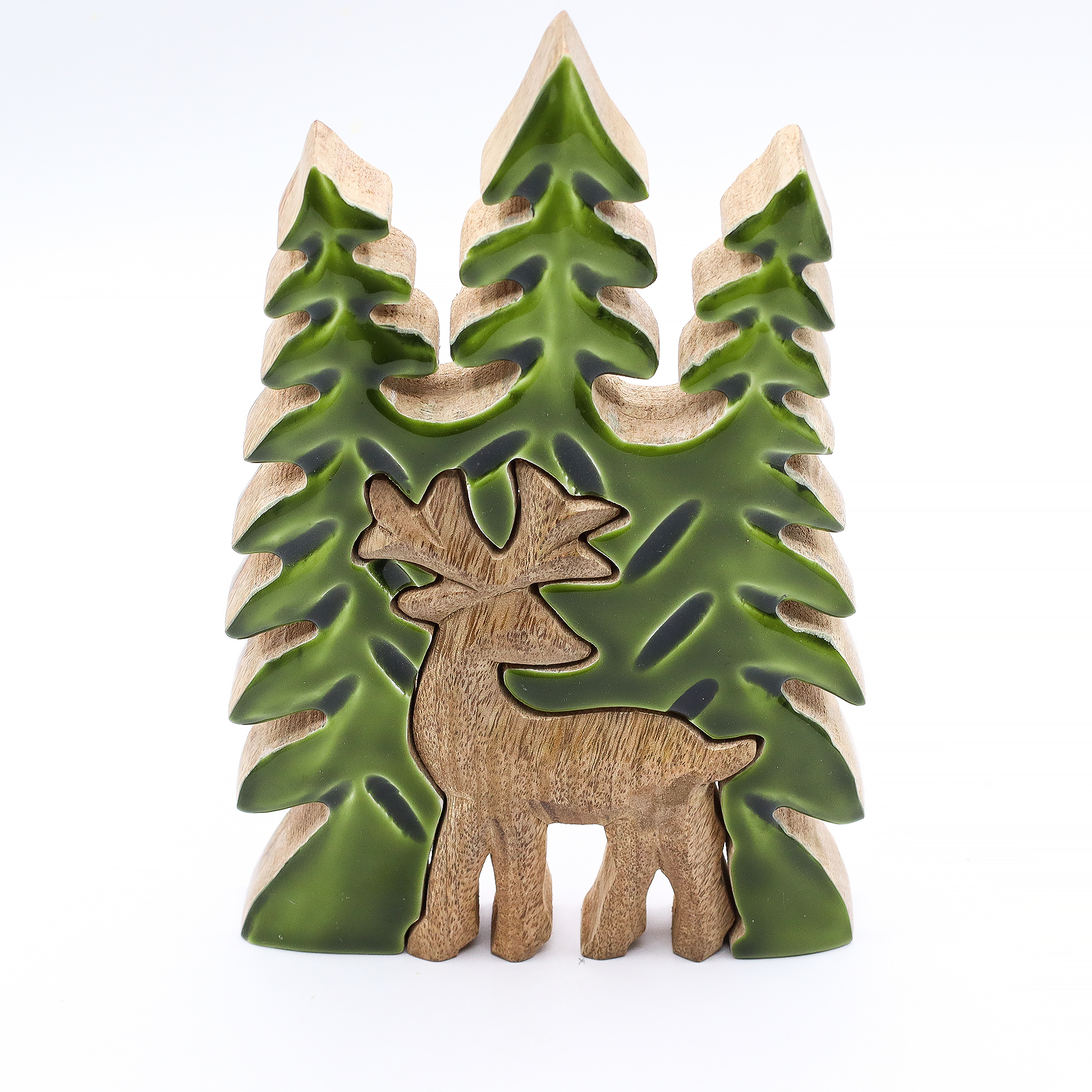 Cette impressionnante décoration en bois 3D représentant un cerf dans la forêt capture toute la majesté du milieu naturel. Sculptée à la main en Inde à partir de bois de manguier durable, elle offre une silhouette saisissante de cerf en relief au cœur d’un décor forestier.