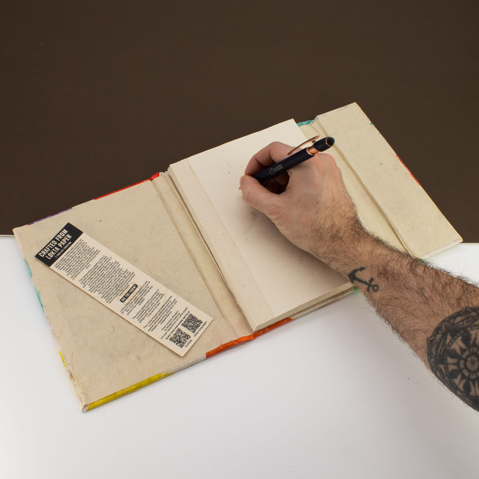 L'association d'une couverture robuste faite main et de pages douces lui confère un aspect joyeux et artisanal qui se démarque en rayon.