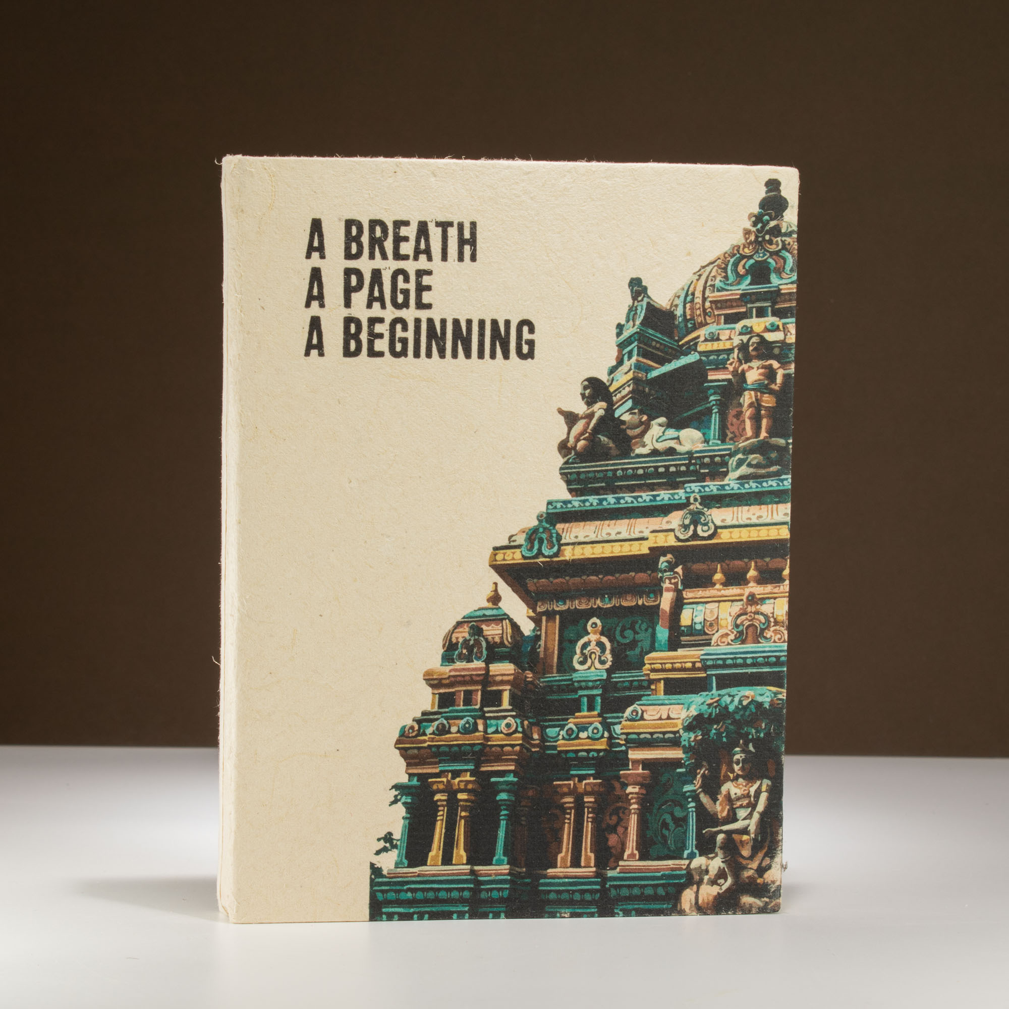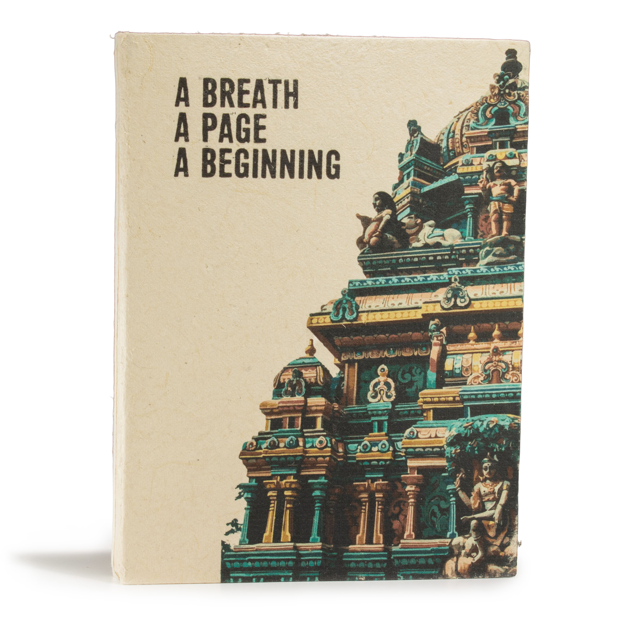 Calme et poétique, ce carnet arbore un motif de temple architectural associé à la phrase « Un souffle, une page, un commencement », évoquant la concentration et le renouveau personnel.