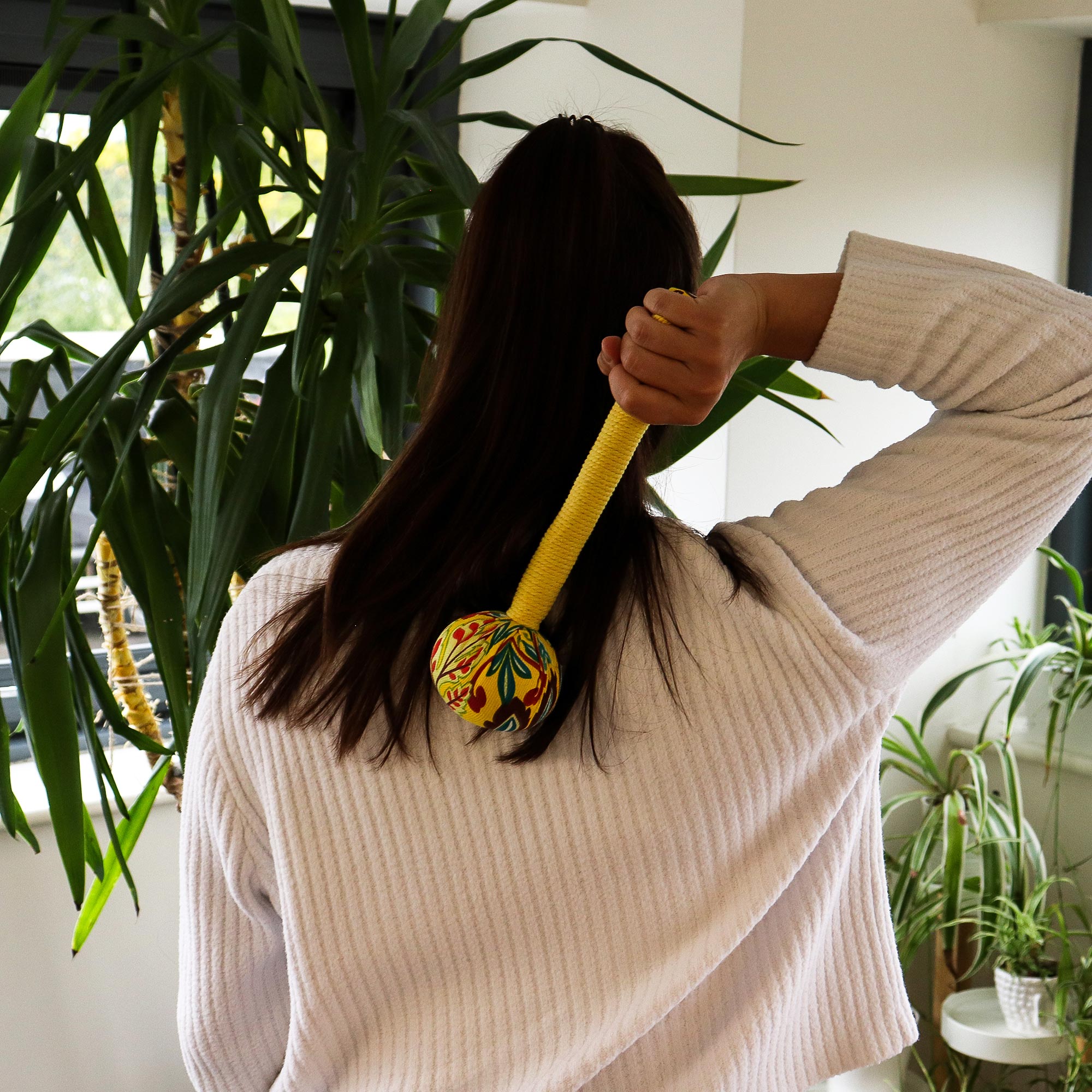 Apportez une touche chaleureuse et stimulante à votre gamme de bien-être avec le Marteau De Massage À L’Absinthe Jaune Citron. Conçu avec un manche en bois solide et une tête en coton et lin remplie d’absinthe séchée, cet outil de massage offre une expérience apaisante et unique que vos clients apprécieront.