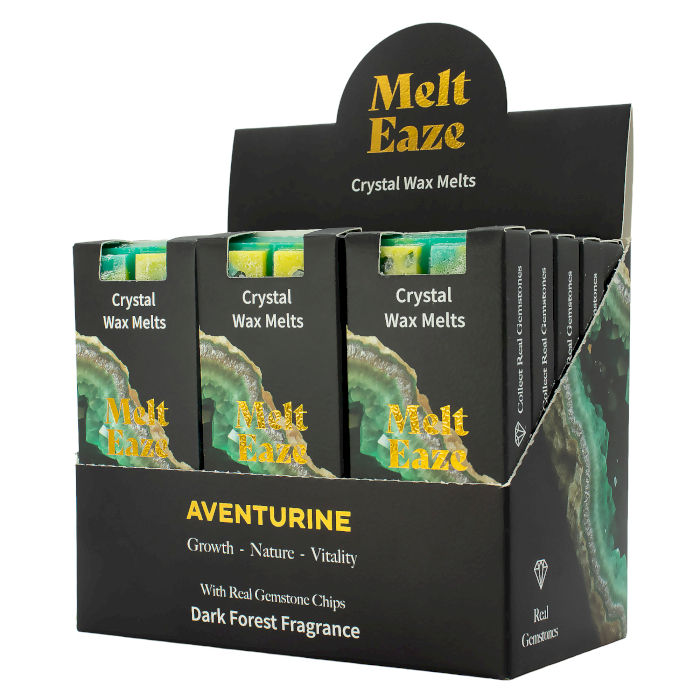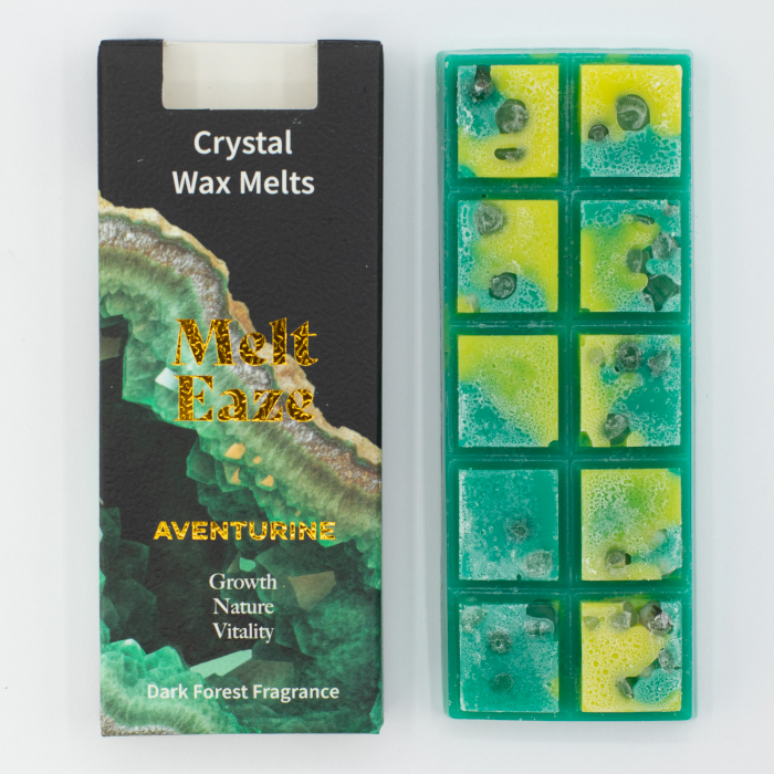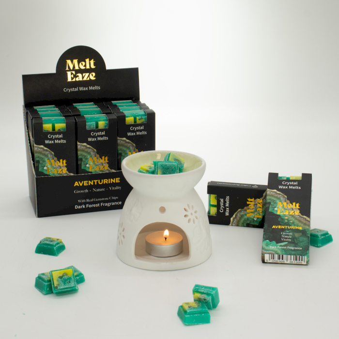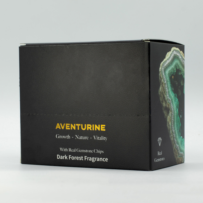 Lorsque la cire fond, de véritables éclats d’Aventurine apparaissent, symbolisant la croissance, la nature et la vitalité, renforçant la connexion émotionnelle au produit.