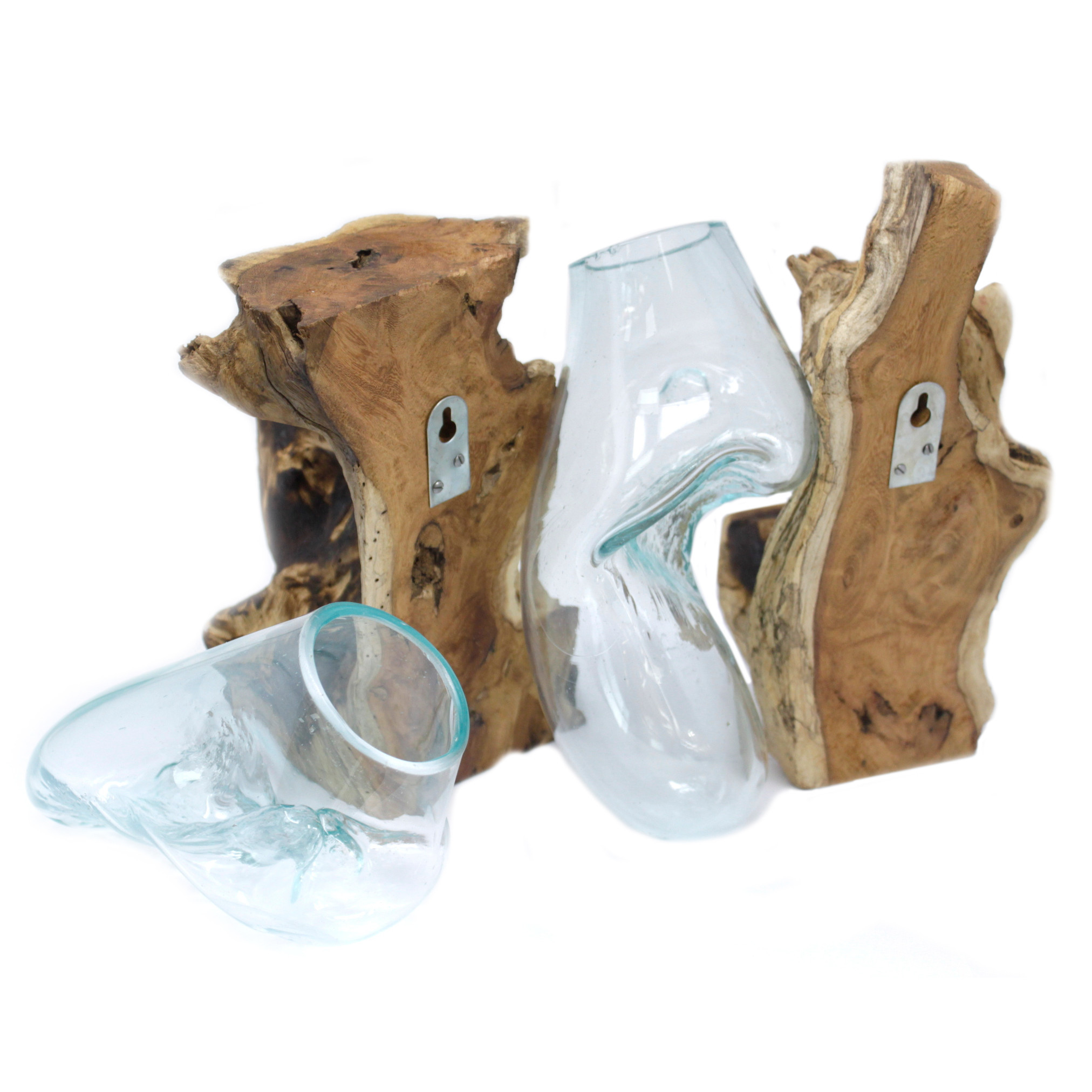 Ce superbe vase en verre d'art en fusion réunit le meilleur de deux mondes : naturel et artificiel ; terreux et chic; pratique et spirituel. Le verre est soufflé à la bouche et alors qu'il est encore chaud, il est ensuite détendu sur un morceau de racine de Gamal, le verre durcit ensuite à la forme du bois assurant un ajustement parfait. Ils sont fabriqués à partir d'un produit naturel en utilisant des outils à main de la manière traditionnelle balinaise. Il offre un cadre unique pour les pierres et les plantes aériennes, les fleurs coupées, un aquarium ou une carafe à vin.