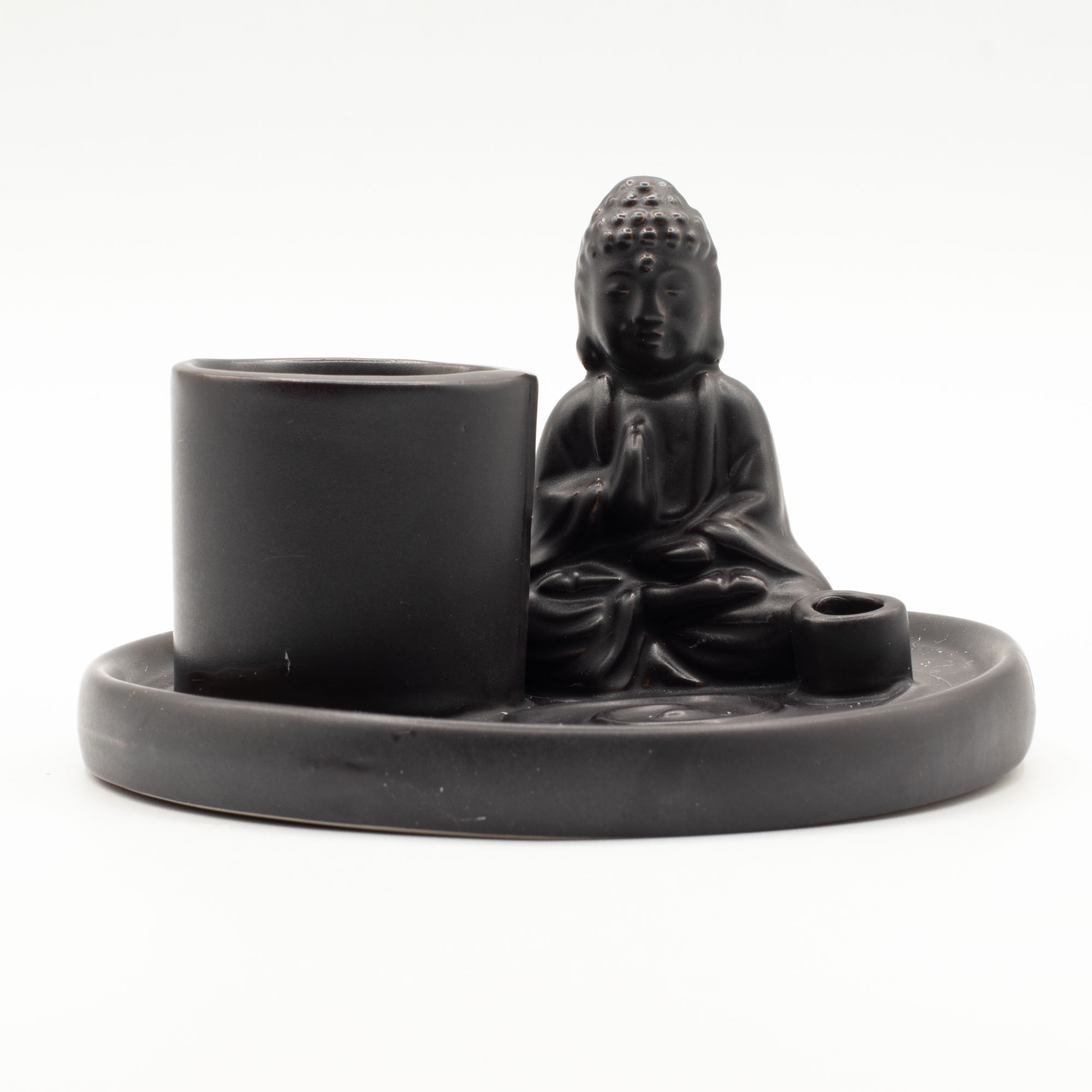 Le design présente un Bouddha assis et serein sur une plaque circulaire avec des supports intégrés pour bâtons et cônes d’encens. La surface en céramique noir mat apporte une touche contemporaine tout en mettant la forme et le symbolisme au premier plan. Pratique pour un usage quotidien, la plaque contient proprement les cendres tout en servant d’élément décoratif subtil.