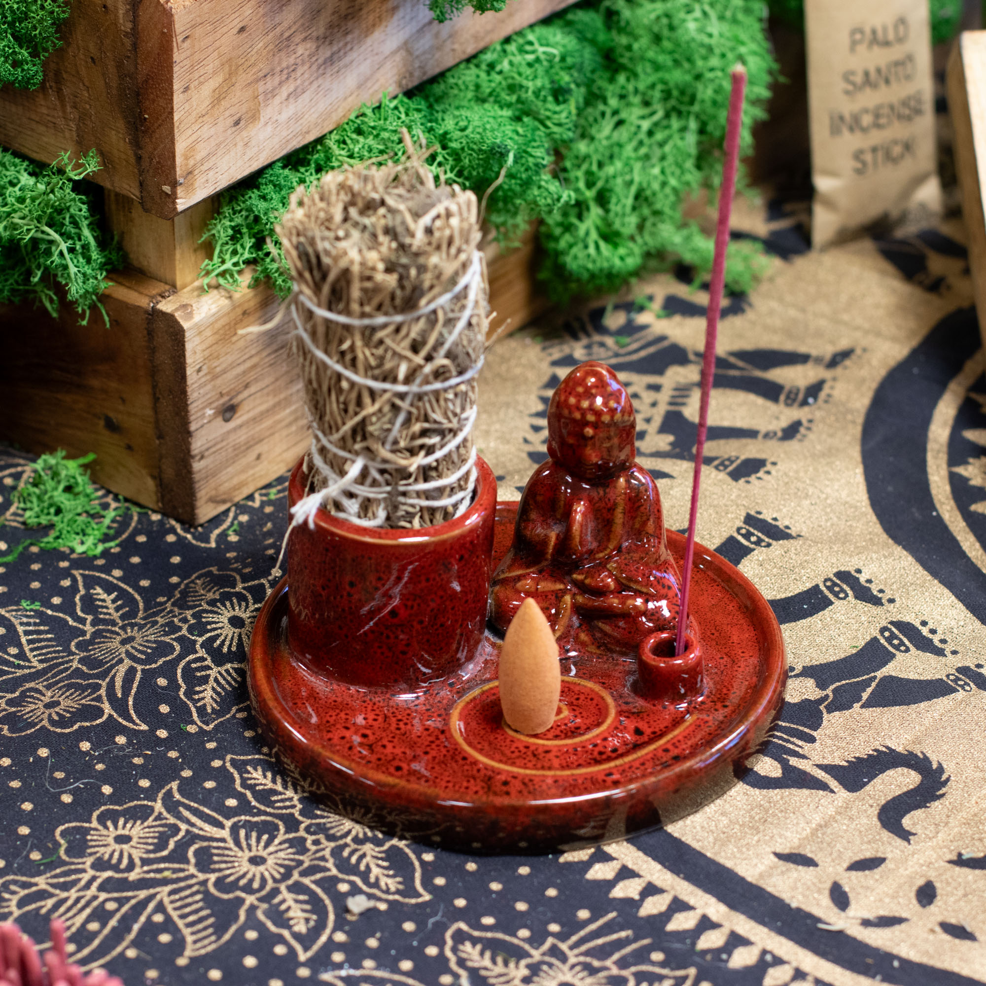 Le design présente un Bouddha assis sur une plaque circulaire avec des supports intégrés pour bâtons et cônes d’encens. L’émail rouge doux a un caractère terreux avec des variations subtiles, donnant à chaque pièce un aspect artisanal que les clients apprécient naturellement. Conçue pour un usage rituel quotidien, elle contient proprement les cendres tout en servant de point focal décoratif.