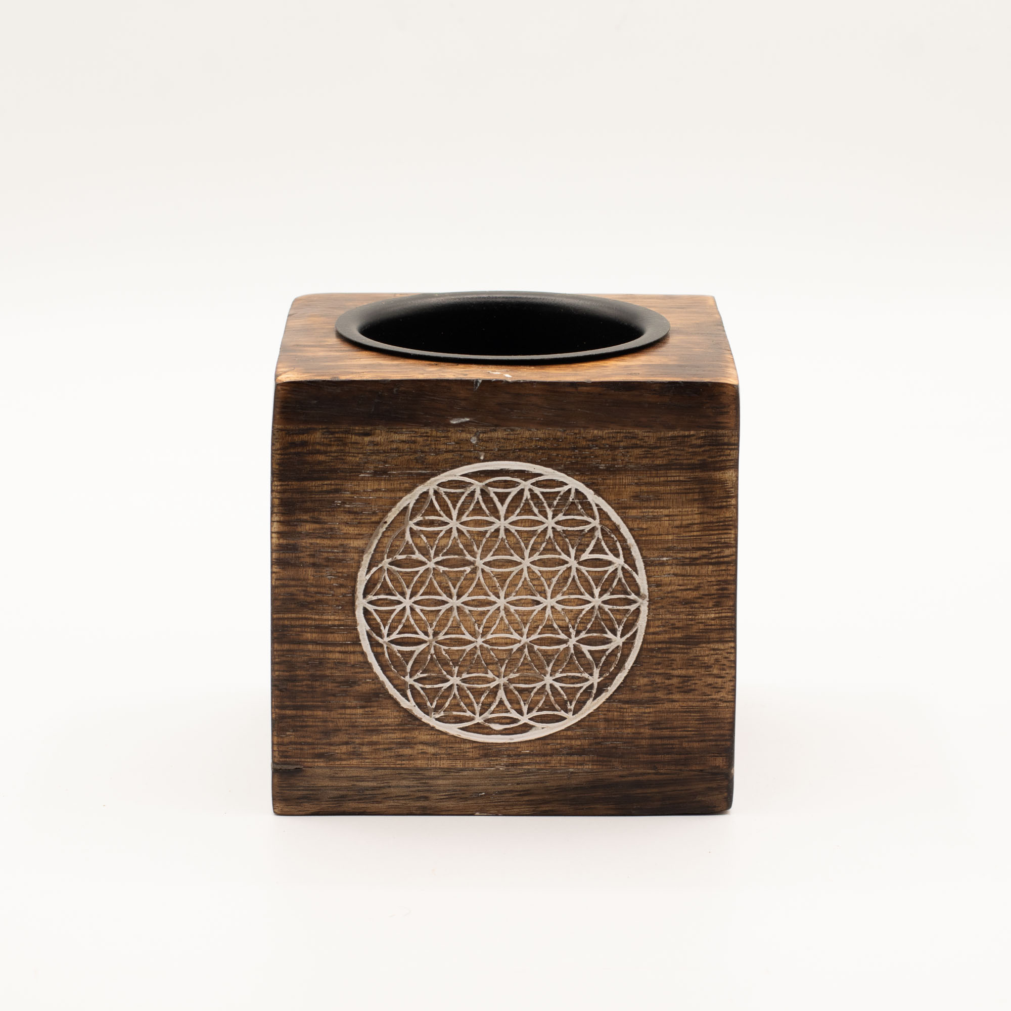 Avec son motif Fleur de Vie, ce brûleur d’huiles propose un design géométrique et contemporain tout en portant une signification symbolique liée à l’harmonie et à la création. Fabriqué en bois de manguier, il s’intègre parfaitement dans des intérieurs modernes comme spirituels.