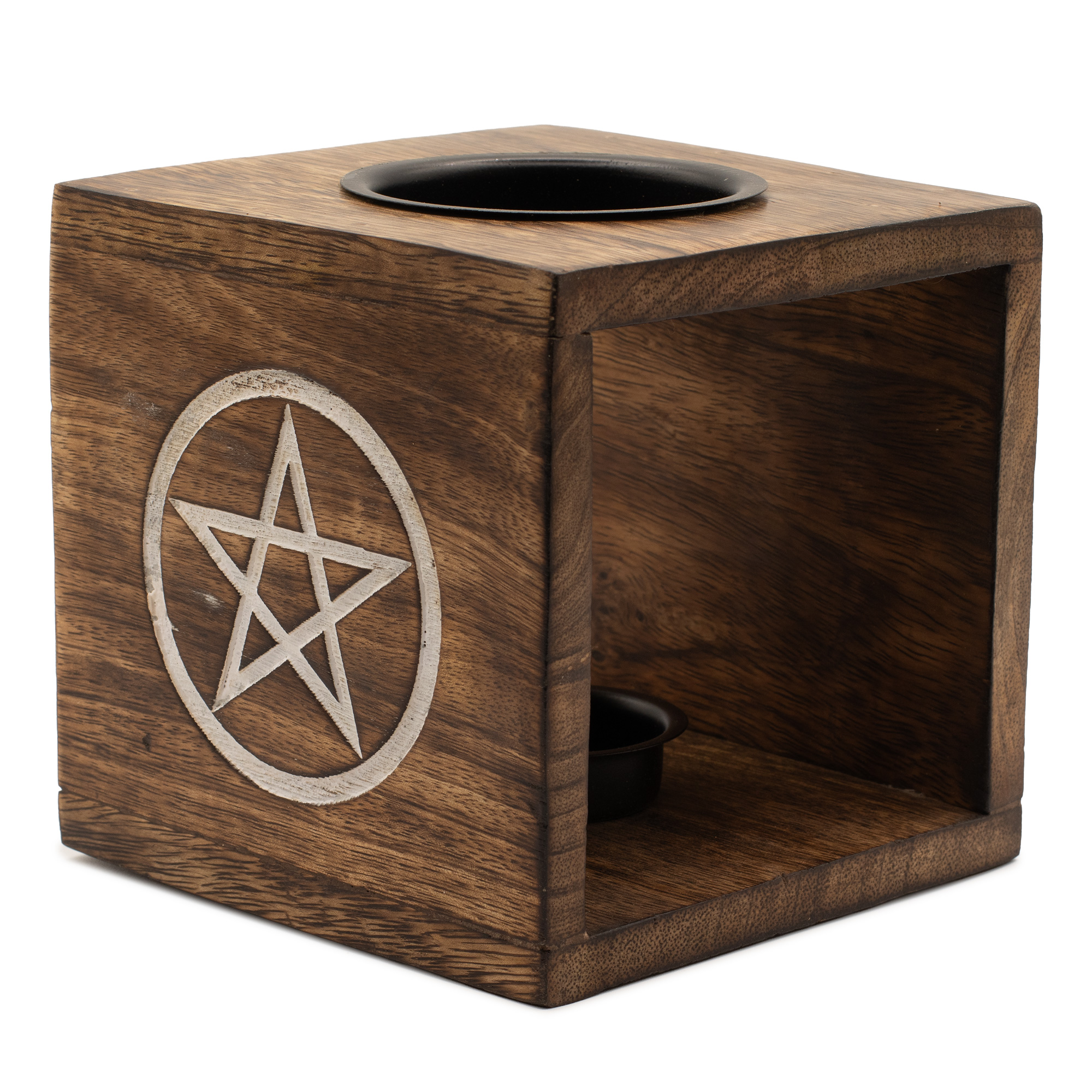 Ce grand brûleur est fabriqué en bois de manguier massif et orné d’un symbole de Pentagone gravé et peint, souvent associé à l’équilibre, à la protection et aux éléments naturels. Sa forme carrée épurée lui confère un aspect contemporain, tandis que la gravure crée de la profondeur et un intérêt visuel lorsque la bougie est allumée.