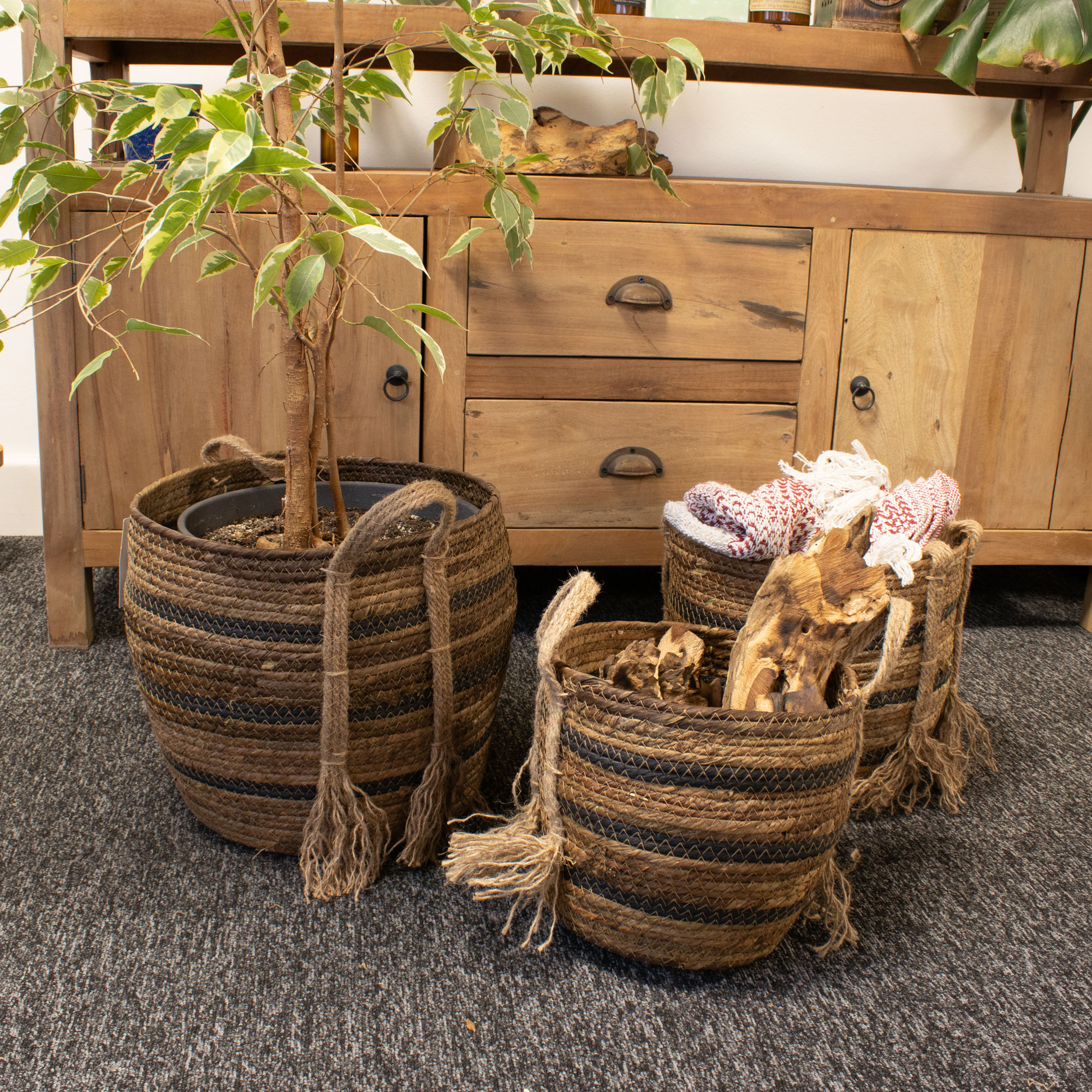Les Grandes Panières en Feuille de Banane & Herbe Marine – Marron Naturel sont tressées à la main à partir de fibres naturelles de feuille de bananier et d’herbe marine, selon une technique traditionnelle, où de longues fibres sont enroulées et cousues pour créer une forme solide et structurée. Le tissage en couches produit de subtiles variations de tons et de textures, donnant à chaque panier un caractère unique tout en conservant une finition marron naturelle harmonieuse. Les détails de pompons décoratifs et les poignées en corde robuste ajoutent une touche artisanale détendue, mettant en valeur la qualité artisanale du design.