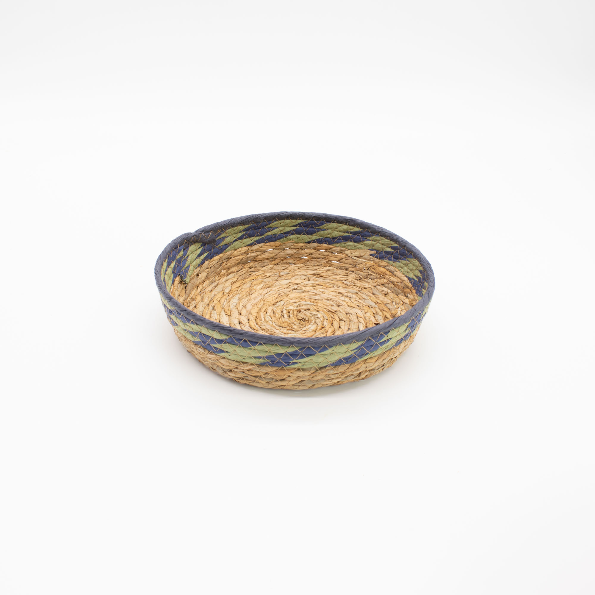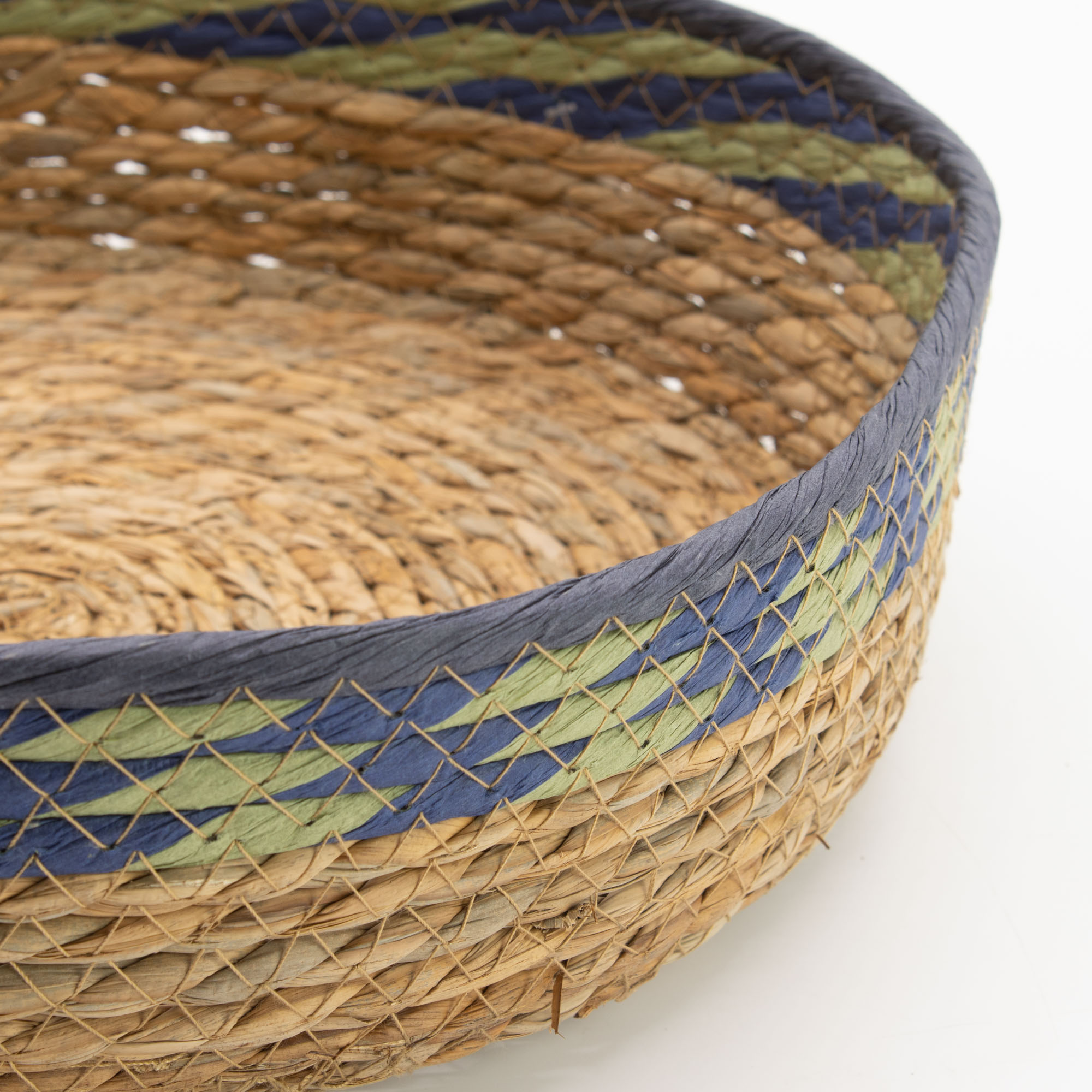 Les Plateaux Paniers en Paille & Herbe Marine – Naturel avec Vert & Bleu sont tressés à la main selon une technique traditionnelle, créant une base solide et structurée tout en conservant la flexibilité naturelle du matériau. Le tissage met en valeur de subtiles variations tonales, tandis que les bords décoratifs verts et bleus ajoutent un accent de couleur qui renforce le caractère artisanal de chaque pièce.