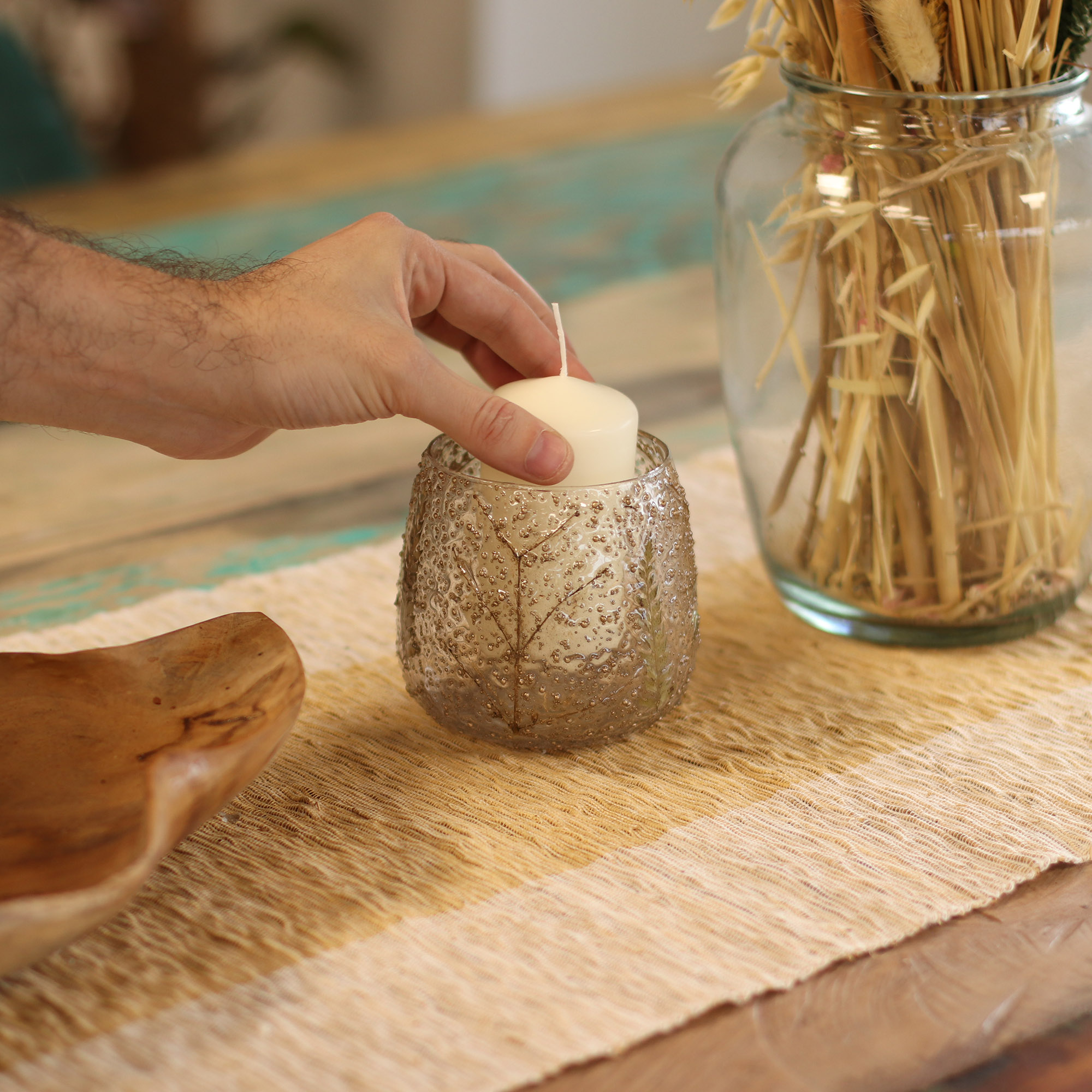 Le Porte-Bougie Droit Pino en Verre Floral Naturel présente de véritables feuillages pressés intégrés dans du verre recyclé, donnant à chaque pièce son propre caractère doux et forestier. Le profil droit et moderne s’associe parfaitement au feuillage terreux du design Pino, créant une esthétique naturelle et apaisante.