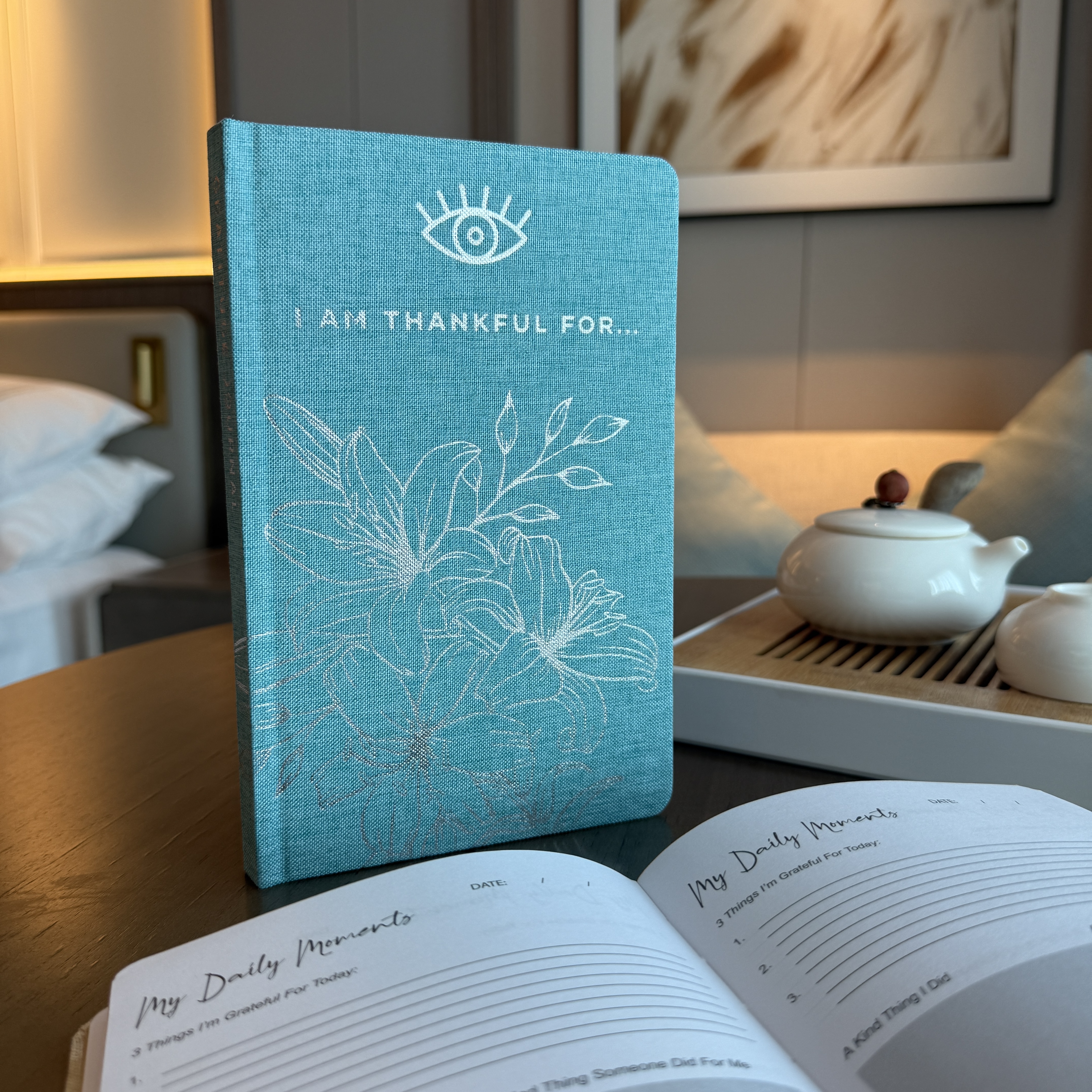 Ajoutez un article réfléchi et élégant à votre catalogue de papeterie avec le Journal de Gratitude Bleu – « I am Thankful For ». Sa couverture bleu éclatant et ses détails soulignés d’argent lui confèrent une finition premium, séduisant les clients en quête de papeterie porteuse de sens et de qualité.