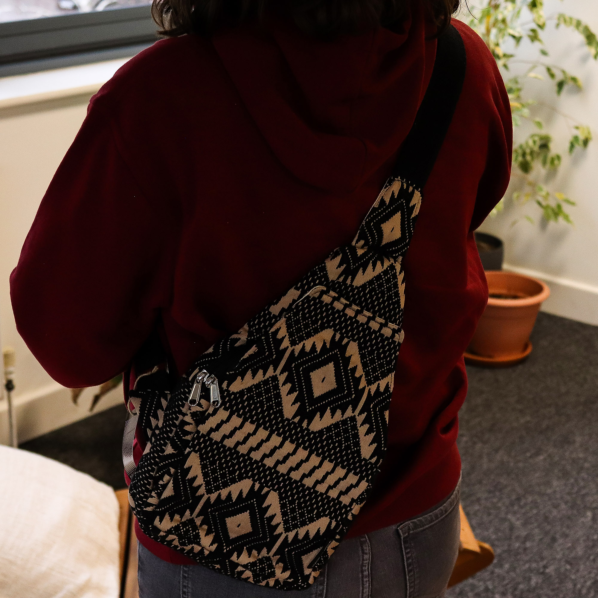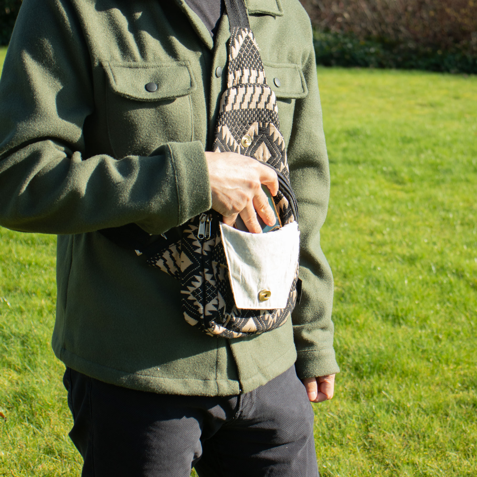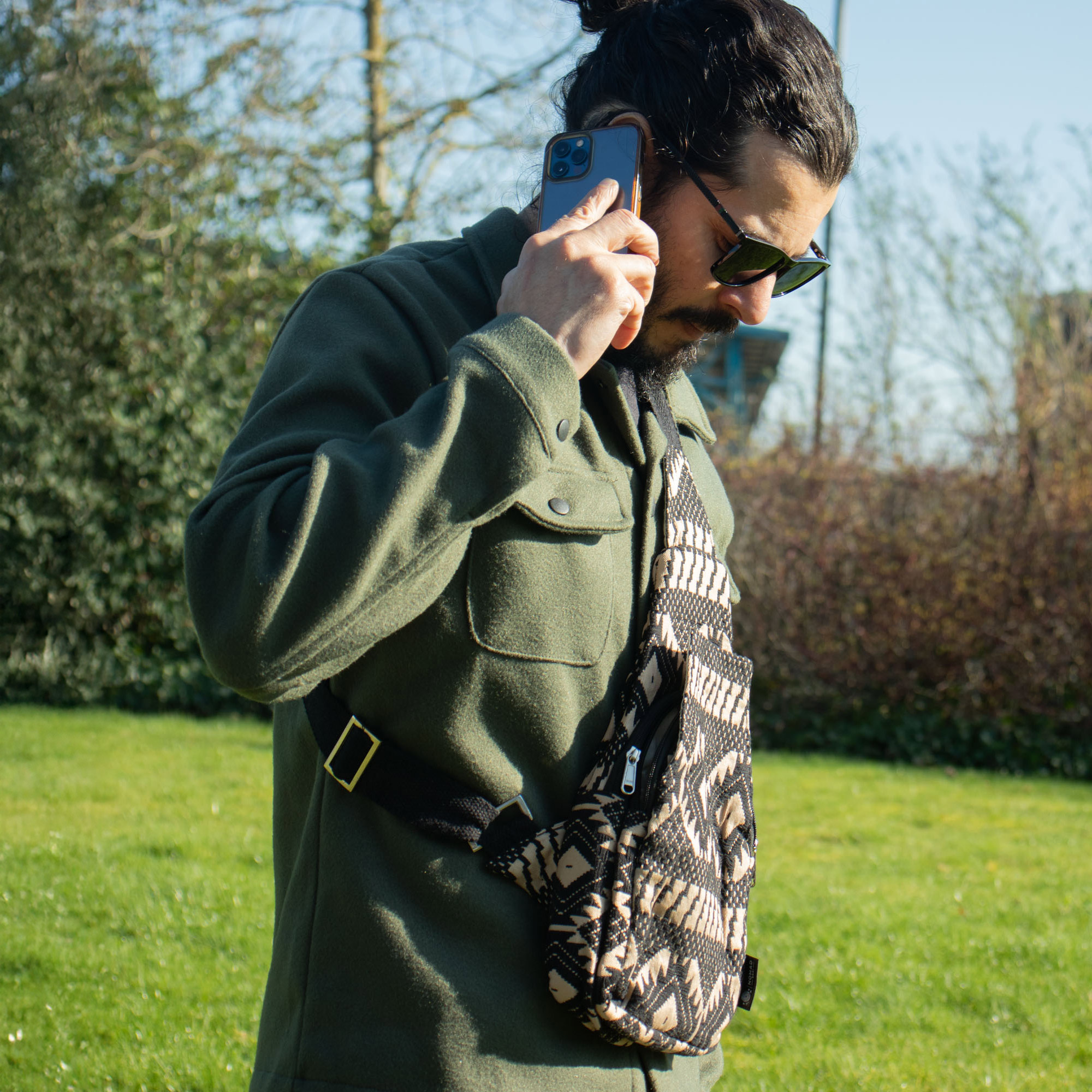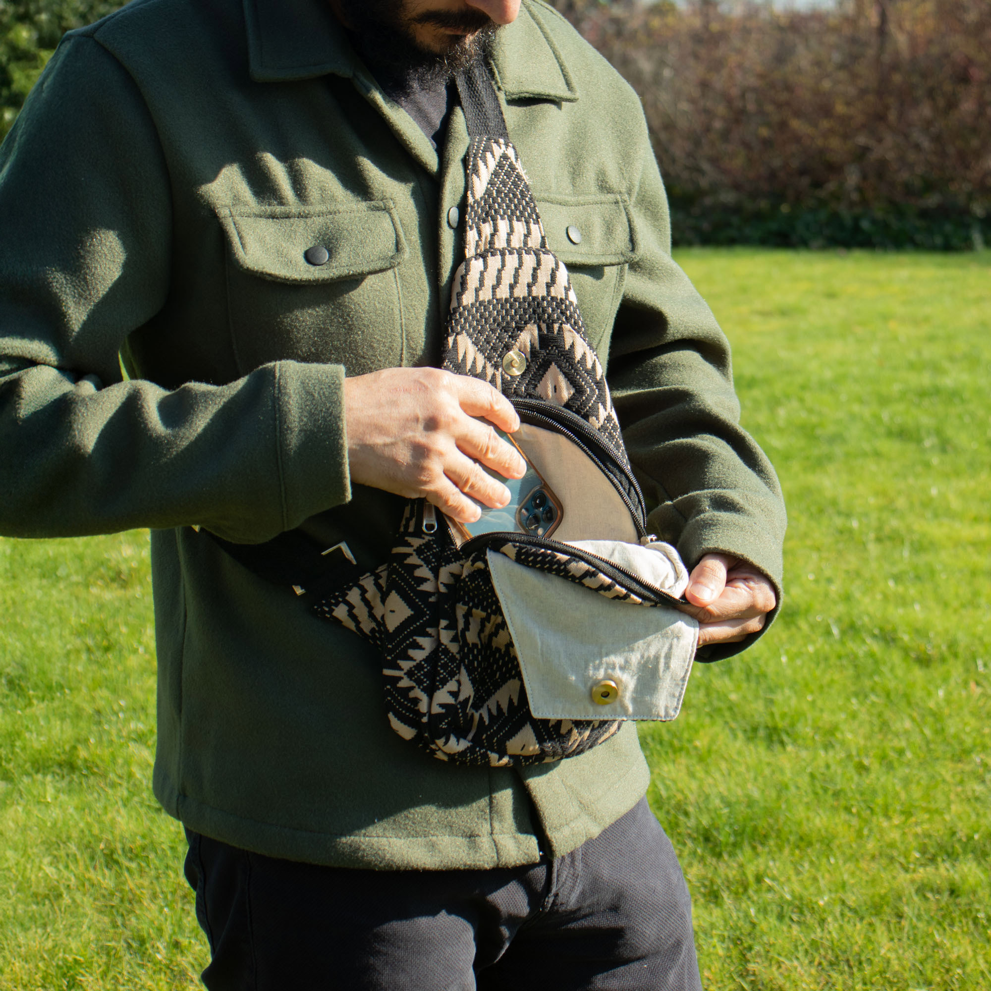 Inspiré par les motifs tribaux et les tons naturels, le Sac Bandoulière Métier du Désert apporte une touche de voyage à toute tenue. Son tissage jacquard noir et sable crée un look géométrique distinctif, parfait pour ceux qui aiment les textures artisanales avec une touche moderne.