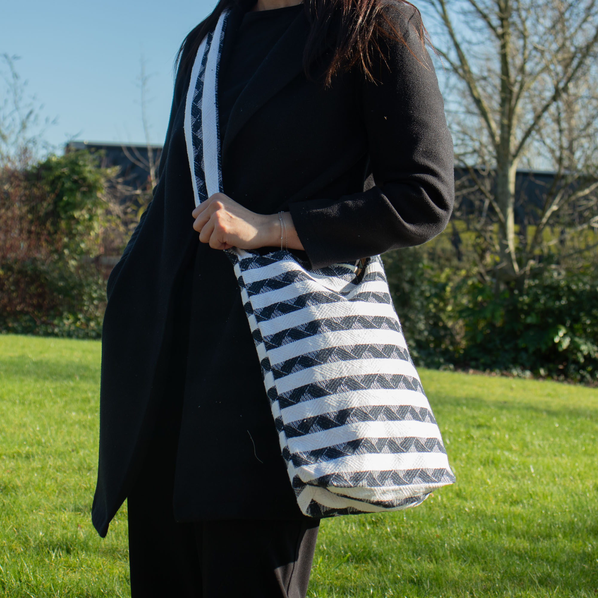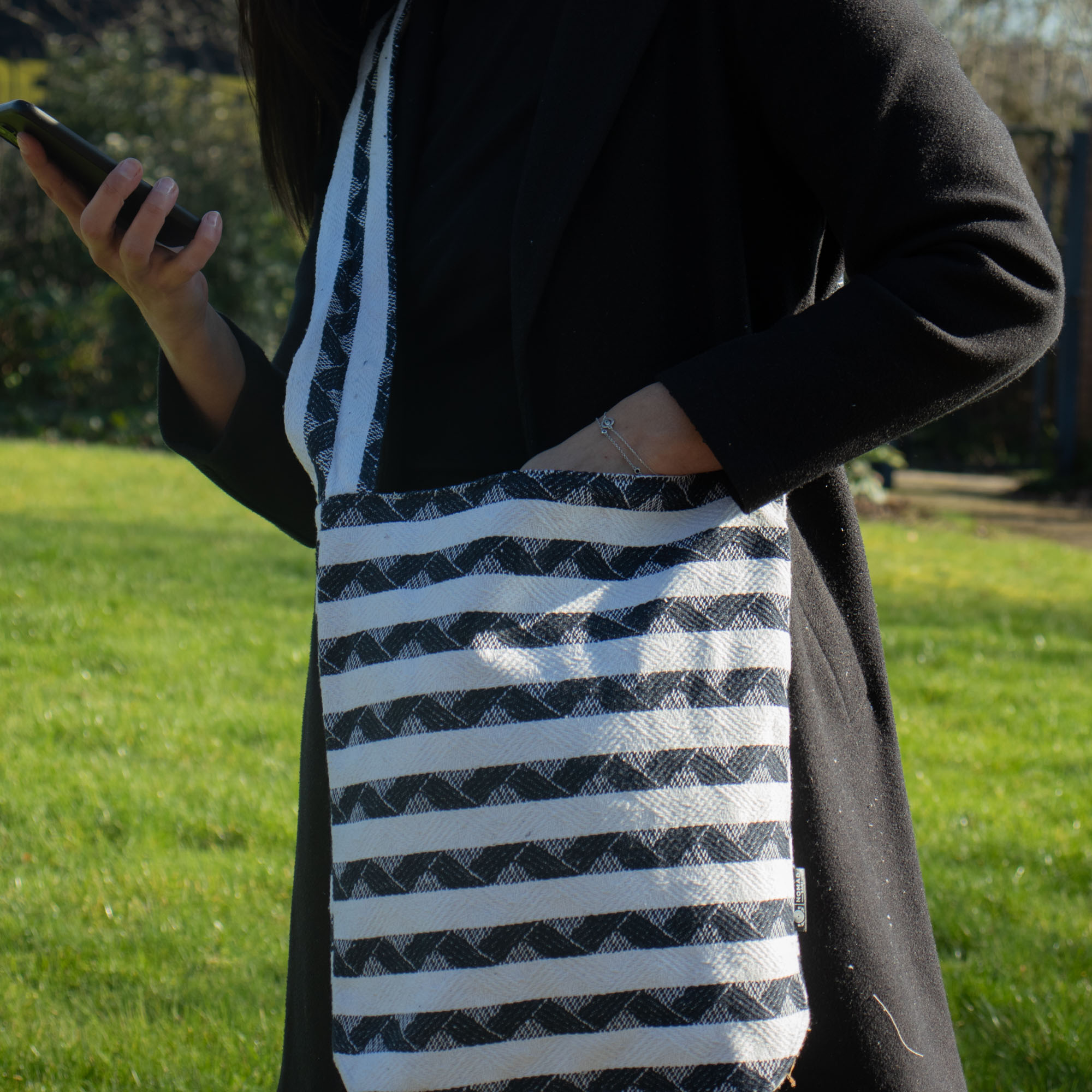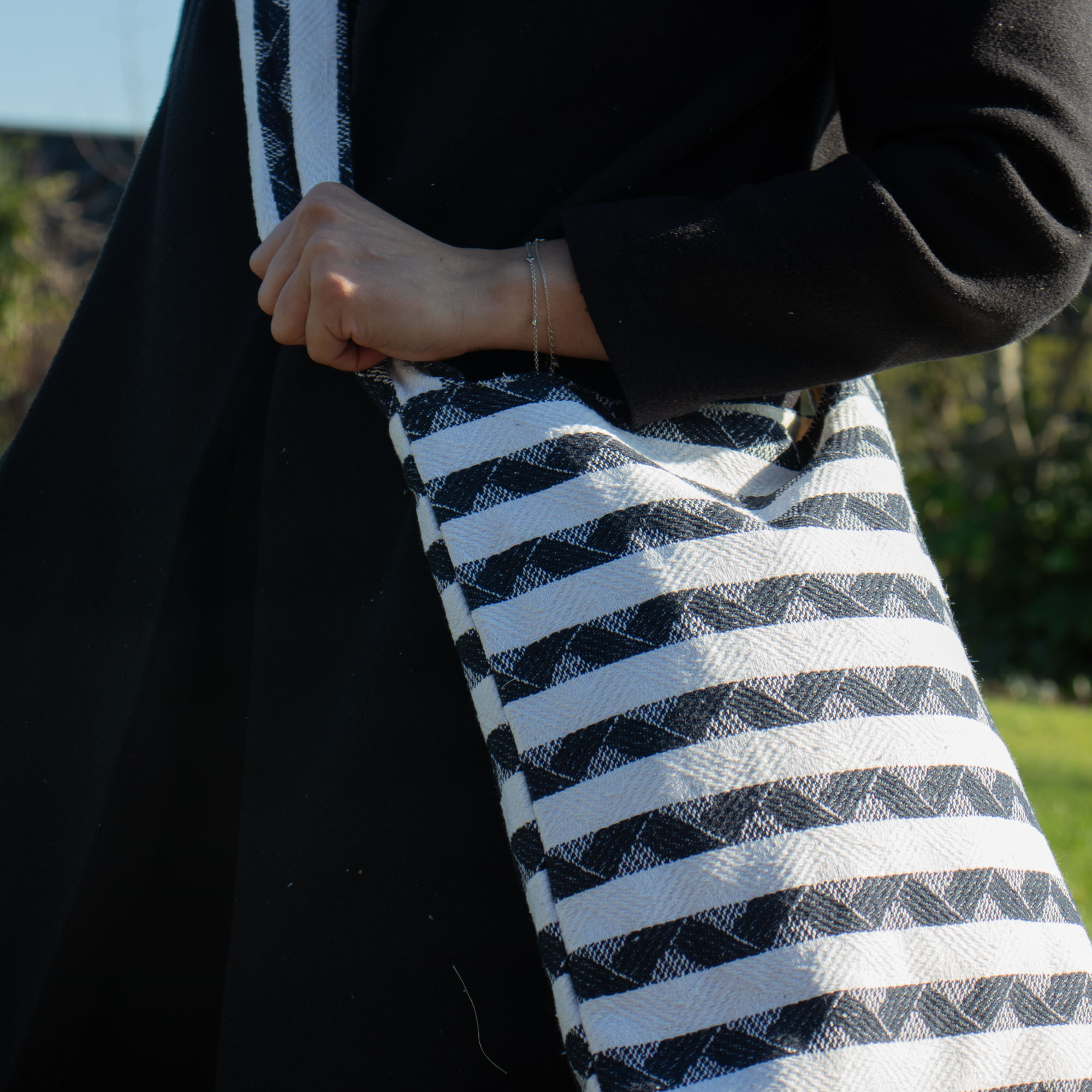 Simple, spacieux et élégant, le Cabas Nomade Atlas est le sac idéal du quotidien. Avec ses rayures jacquard noir et blanc classiques, il est parfait pour ceux qui apprécient le design fonctionnel avec une touche artisanale.
