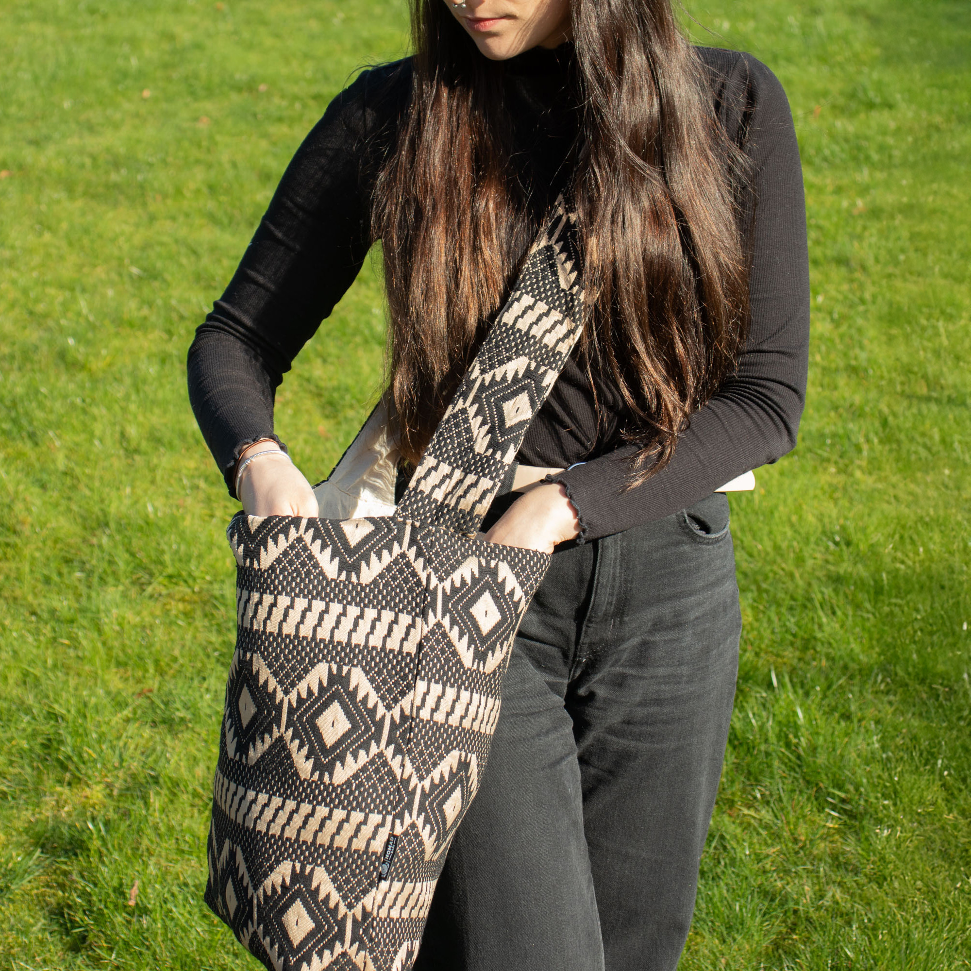 Le Cabas Nomade Métier du Désert combine design audacieux et fonctionnalité quotidienne. Avec son jacquard noir et sable à motif géométrique, il apporte une touche artisanale à toutes les tenues.