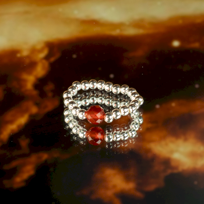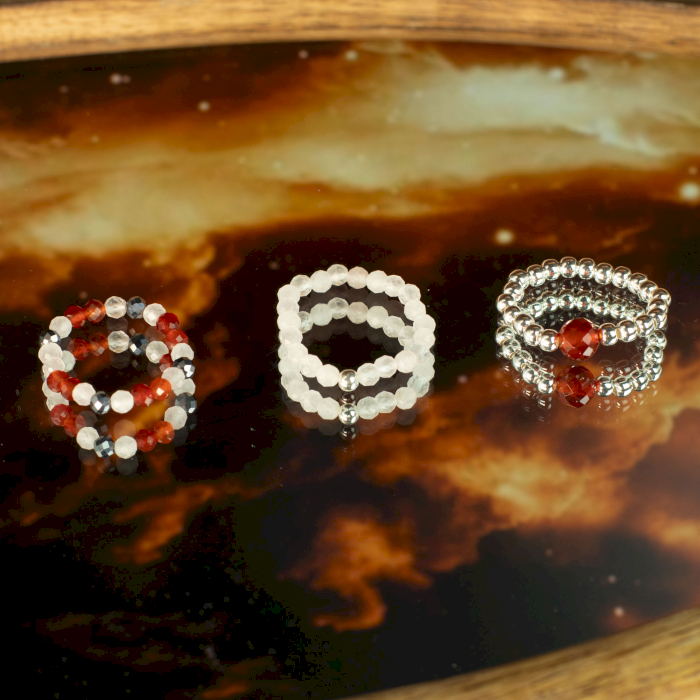 Portées ensemble, les bagues forment une déclaration cohérente, symbolisant connexion, dévotion et énergie durable. L’équilibre entre les tons rosés et rouges profonds rend le style romantique sans lourdeur, parfait pour un usage quotidien ou comme cadeau.
