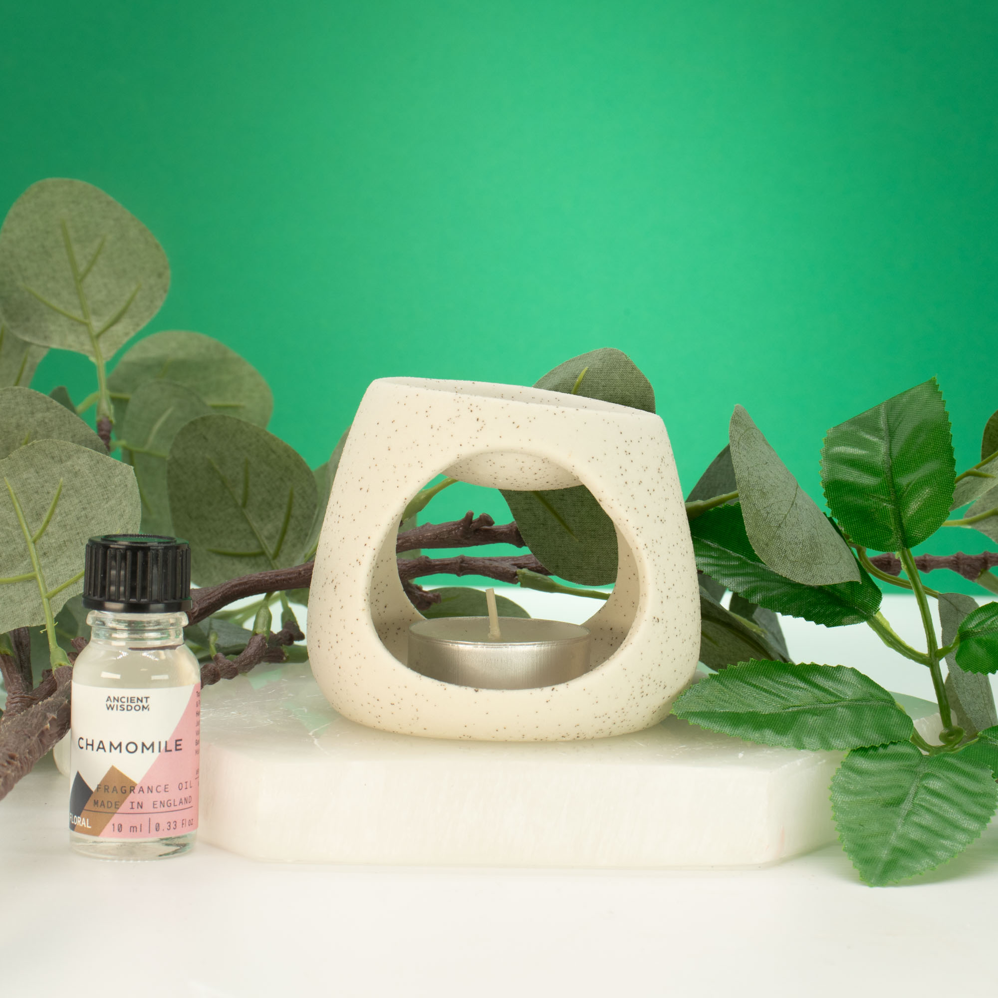 Le Brûleur à Huile Zen en Céramique – Galet rond – Blanc moucheté introduit un design contemporain et apaisant inspiré des formes naturelles de pierre, en faisant un choix idéal pour les concepts retail axés sur le bien-être et le minimalisme.