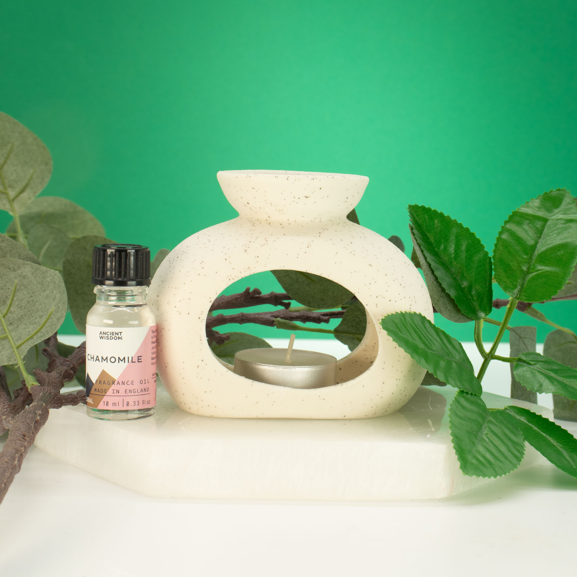 Le Brûleur à Huile Zen en Céramique – Galet ovale – Blanc moucheté propose une interprétation plus allongée et sculpturale de la forme galet classique, en faisant une pièce visuellement forte pour les présentations modernes axées sur le bien-être.