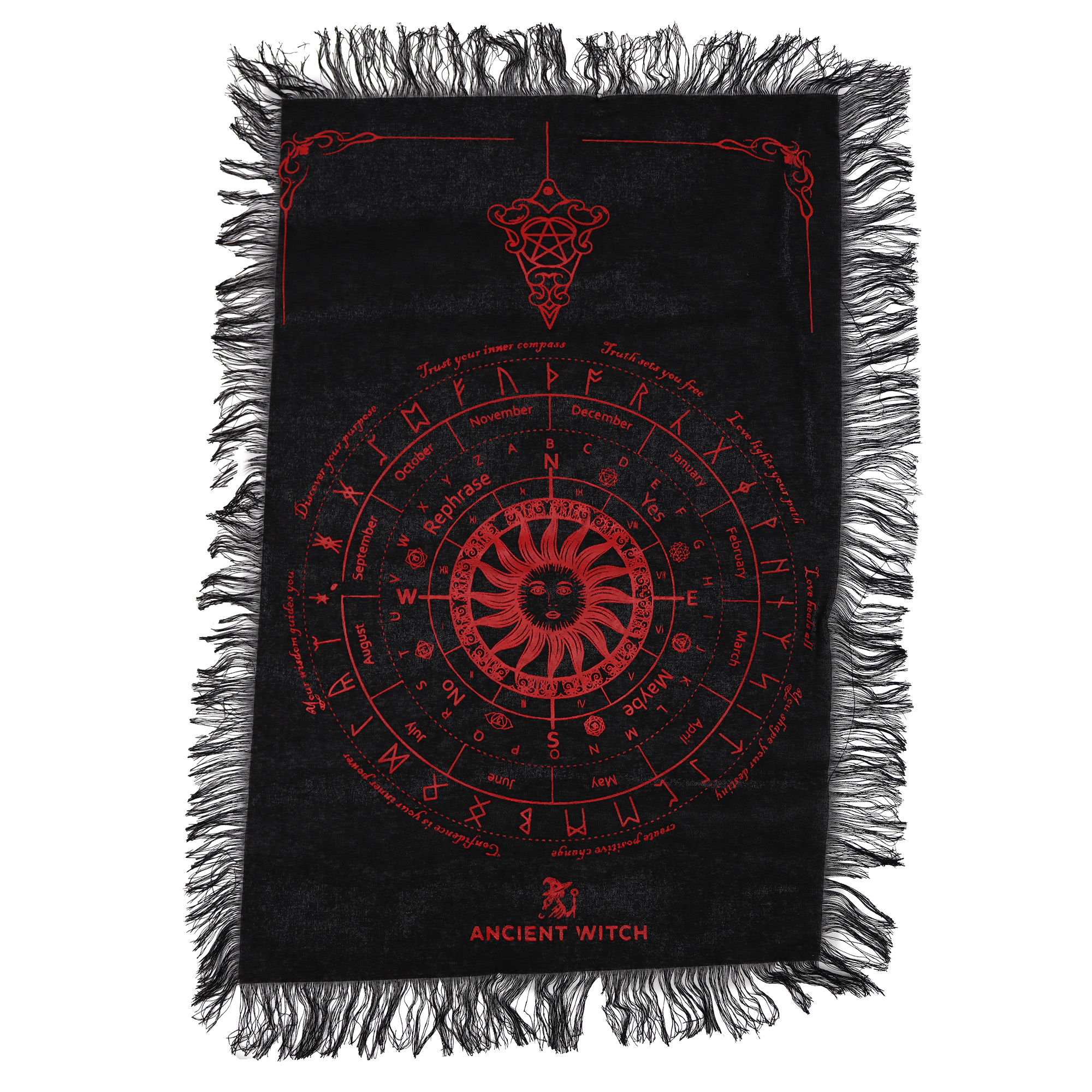 Le graphique circulaire détaillé supporte les lectures de pendule et pratiques divinatoires, offrant une surface clairement définie, à la fois fonctionnelle et atmosphérique. Les bords frangés encadrent joliment la pièce, ajoutant mouvement et profondeur lorsqu’elle est exposée ou posée.