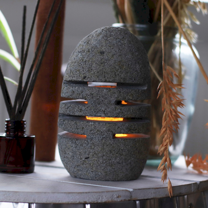 Conçu pour accueillir une bougie chauffe-plat standard, il crée une ambiance calme et apaisante, adaptée à une large gamme de contextes commerciaux. Le design en pierre debout sculptée apporte un intérêt visuel subtil tout en restant facile à intégrer avec le bois, la céramique, les textiles et d’autres matériaux bruts.