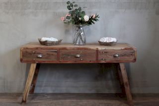 Chaque pièce de ce mobilier de bureau que nous importons est fabriquée avec amour à Bali à partir de bois de teck indonésien récupéré sur des bateaux de pêche à la retraite. Le bois séché conserve certaines des couleurs d'origine et la finition rustique et constitue une toile de fond parfaite pour afficher n'importe quelle gamme de vos produits ou comme un joli ajout à n'importe quelle décoration d'intérieur. Celui-ci est séché dans des fours à bois spéciaux à faible consommation d'énergie que nous avons conçus en interne, ce qui porte sa teneur en humidité à celle que l'on trouve dans les maisons européennes. La plupart des meubles de bureau sont sur des pieds en métal vintage, ce qui donne une sensation d'entrepôt/vintage.