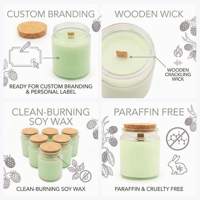 Ajoutez un parfum botanique frais à votre collection avec la Bougie en Cire de Soja Woodwick – Vigne Crépusculaire. Conçue pour les détaillants développant leurs propres collections de bougies, cette bougie sans étiquette est prête à personnaliser avec vos propres étiquettes et packaging. Le bocal en verre transparent et le couvercle en liège naturel offrent une présentation simple et moderne, adaptée à une large gamme de concepts retail.
