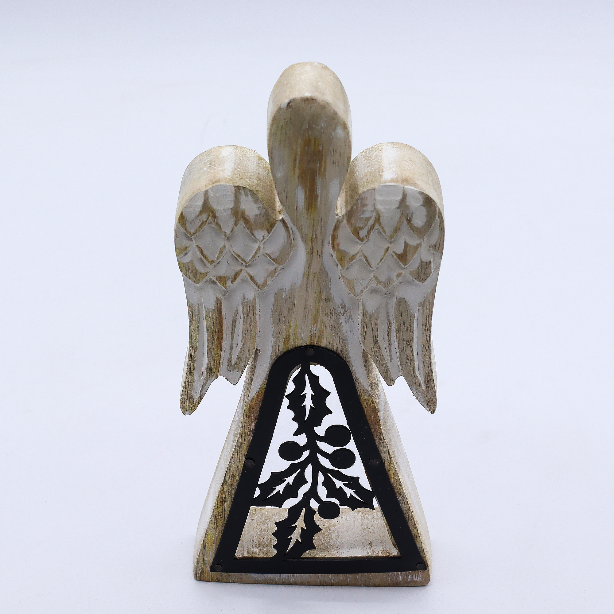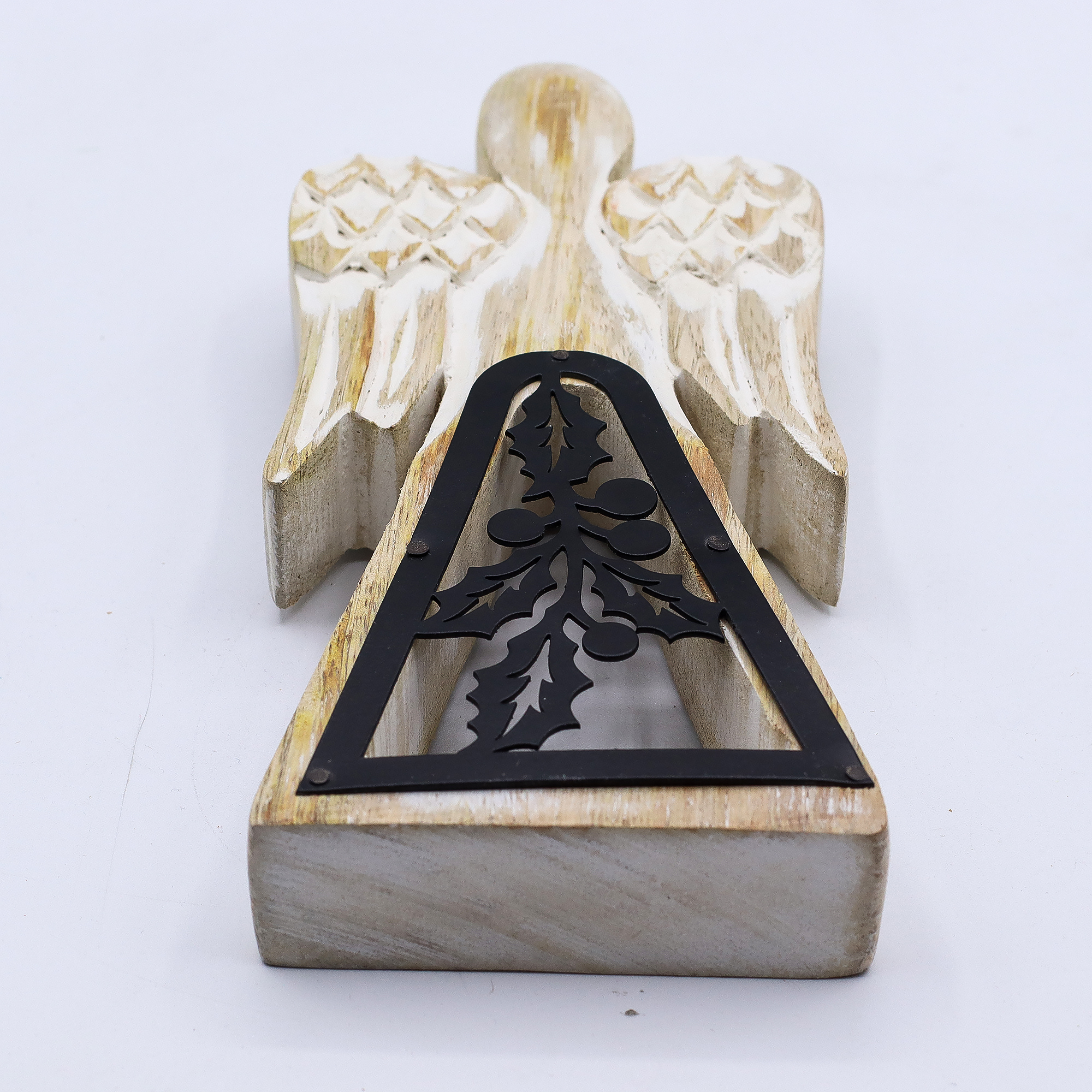 Cet Ange en Bois de Manguier - Blanchi à la Chaux avec Découpe en Fer – blanchi à la chaux avec décor en fer découpé allie charme rustique et détails artistiques.